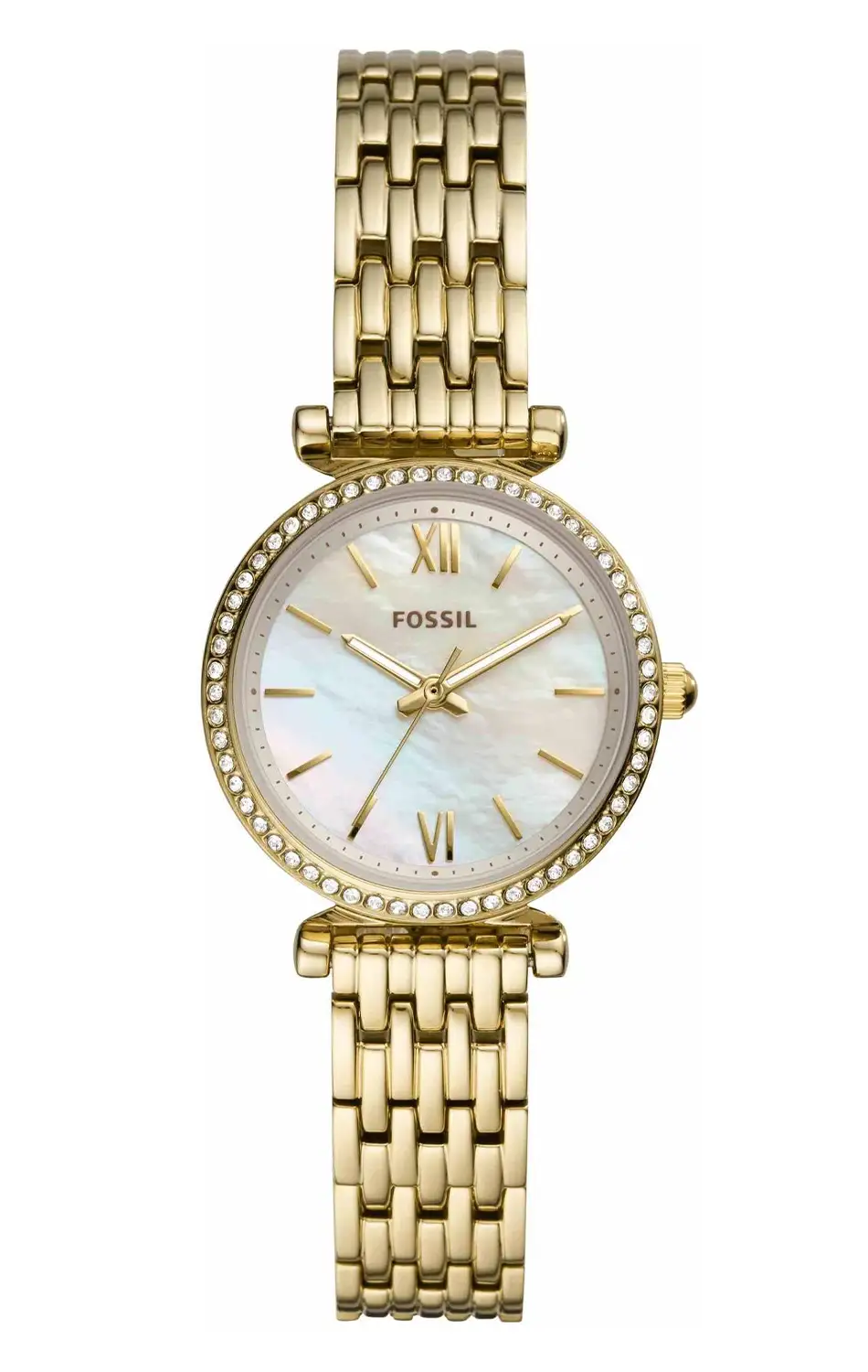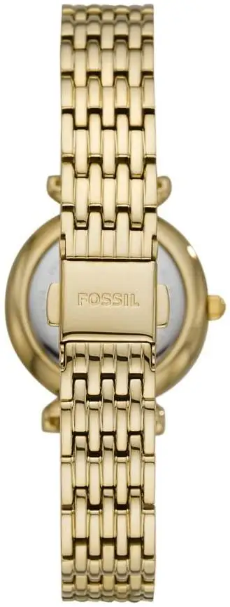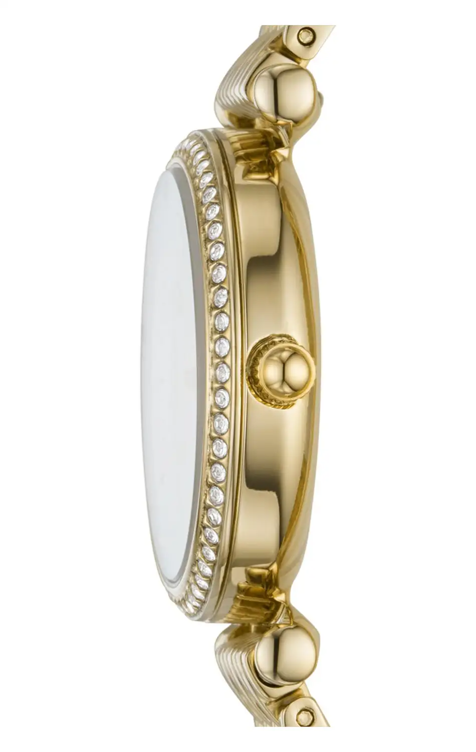 Dámské hodinky Fossil Carlie Mini ES4735 jsou čistou bižuterií uzavřenou do podoby subtilního časoměřiče. Pozlacené 28milimetrové pouzdro s jemnými proporcemi plynule přechází do efektního náramku a vytváří doplněk, který okamžitě přitahuje pohledy. Bílý ciferník s jemným brusem a pozlacenými ručičkami vnáší nádech svěžesti a elegance, díky čemuž celek působí lehce, žensky a velmi stylově. Jde o model, který zápěstí spíše zdobí, než aby mu dominoval, a dokonale zapadá do estetiky moderní bižuterie.