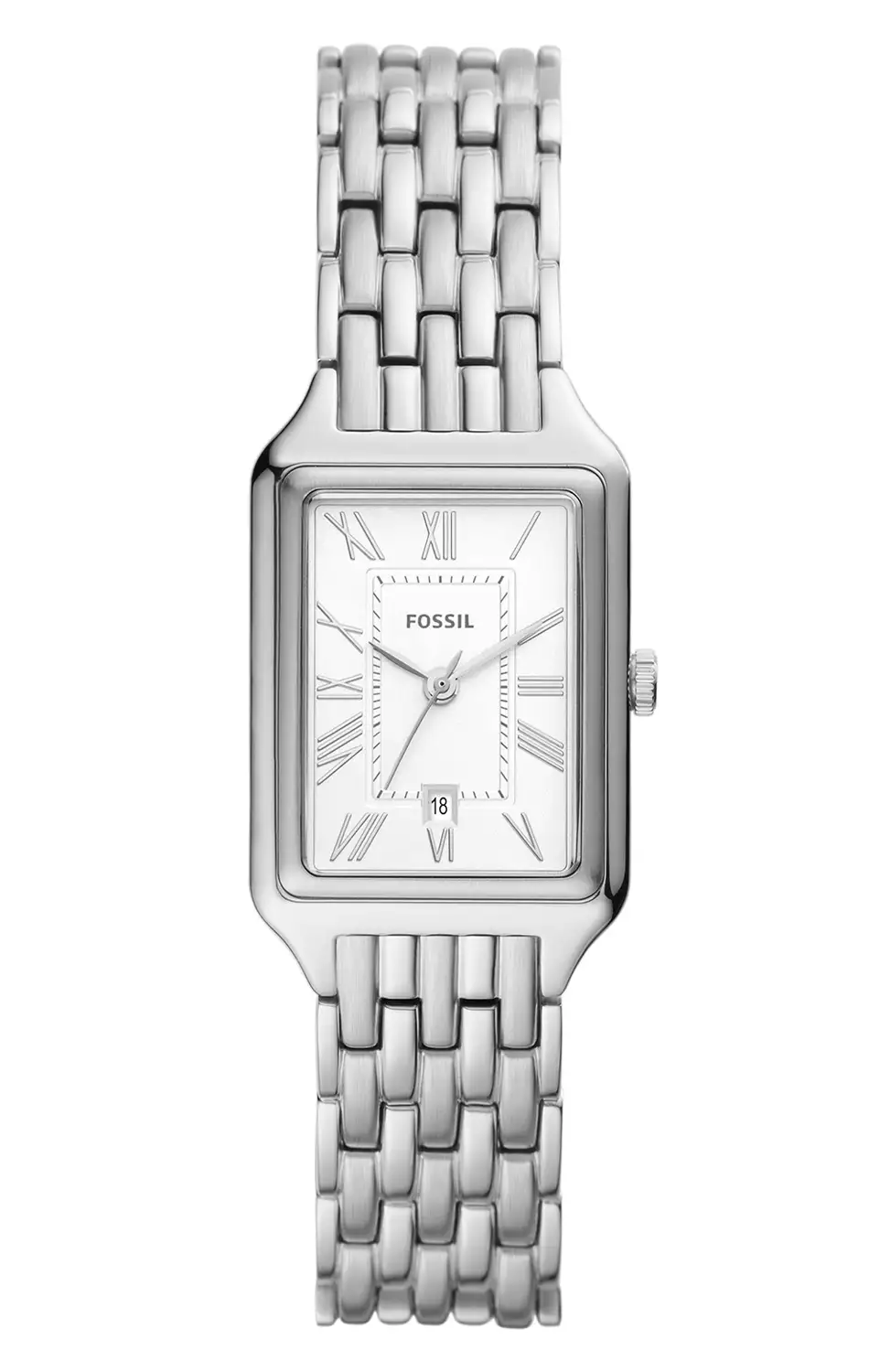 Dámské hodinky Fossil Raquel ES5221 upoutají pozornost už na první pohled výrazně bižuterní formou, která více připomíná elegantní náramek než klasický časoměřič. Štíhlé pouzdro o šířce 23 mm se ideálně usazuje na zápěstí a obdélníkový tvar dodává celku módní, lehce pařížský charakter. Stříbrný ciferník s římskými indexy ve zlatém provedení vytváří kontrast, který podtrhuje luxusní styl a činí z tohoto modelu výrazný doplněk jak ke každodenním outfitům, tak k večerním kombinacím.