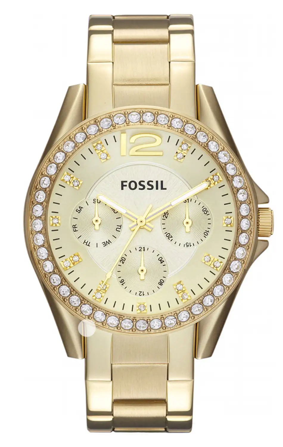 Dámské hodinky Fossil Riley ES3203 jsou návrhem pro ženy, které mají rády výrazné doplňky spojující funkčnost s bižuterním charakterem. Pouzdro o průměru 38 mm, pokryté zlatou PVD povrchovou úpravou, přitahuje pozornost jemným leskem a luneta osazená krystaly dodává celku elegantní, lehce glamour akcent, který se skvěle hodí jak pro každodenní nošení, tak i pro propracovanější stylizace.