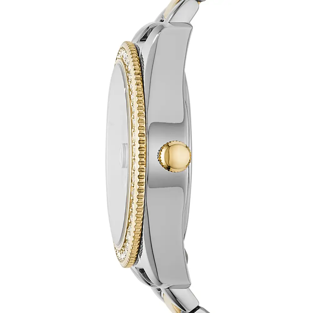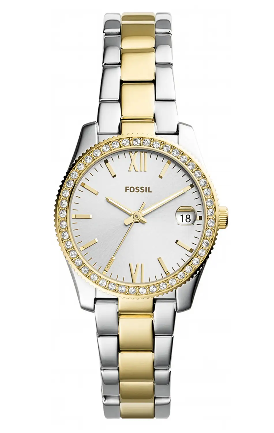 Dámské hodinky Fossil Scarlette ES4319 jsou návrhem pro ženy, které hledají elegantní doplněk s výrazně šperkovým charakterem, ale zároveň natolik univerzální, aby jej bylo možné nosit každý den. Štíhlé pouzdro o průměru 32 mm v bicolor provedení kombinuje chladný odstín oceli s teplým zlatem a třpytivé zirkony osazené kolem lunety jemně podtrhují ženský styl bez efektu přehnanosti. Světlý ciferník s dobře čitelnými indexy a římskými akcenty dodává celku lehce klasický, nadčasový vzhled.