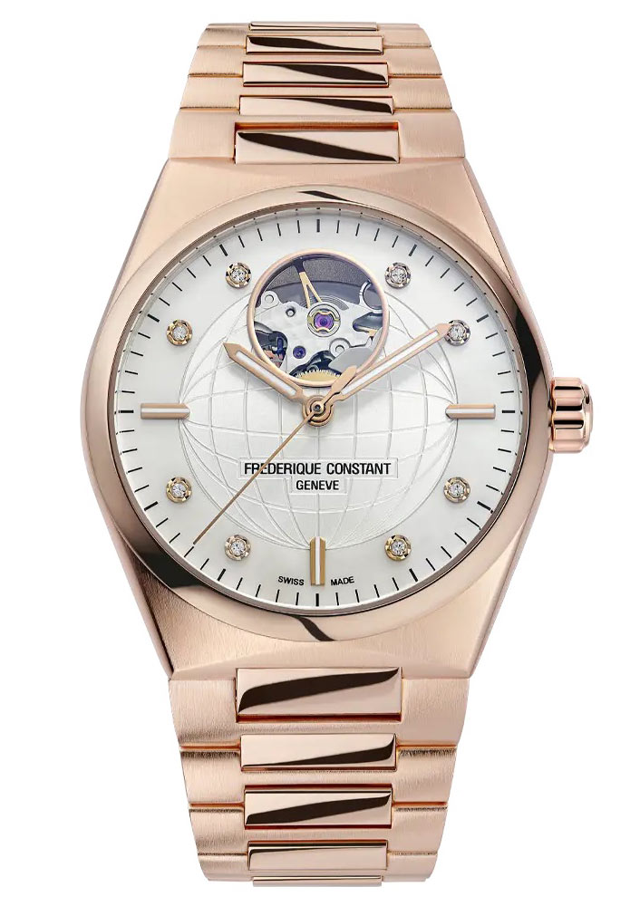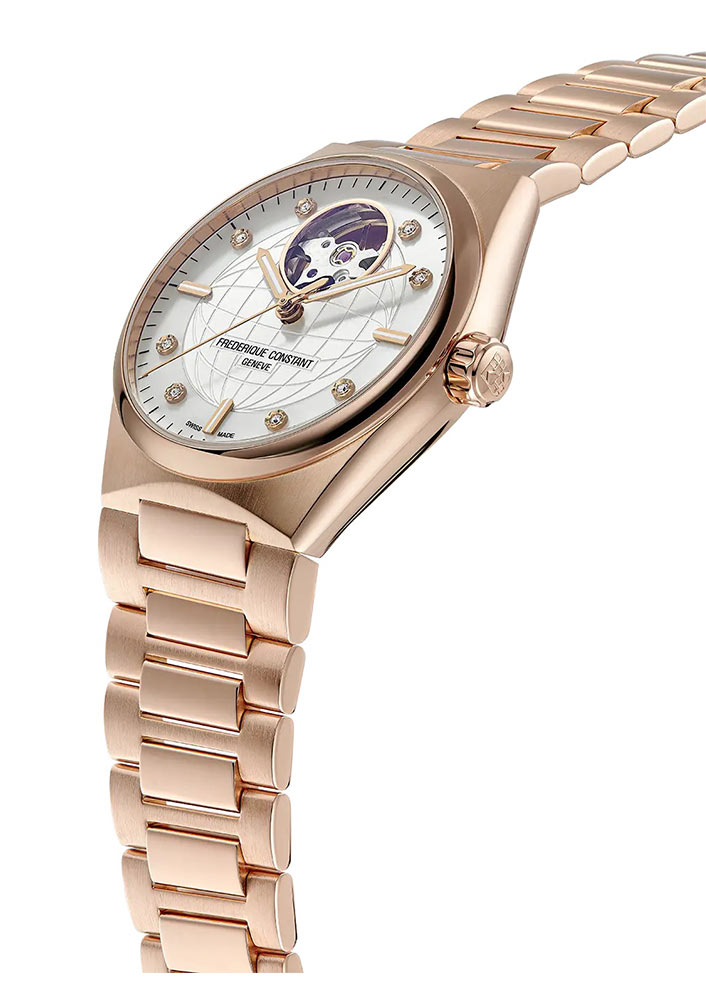 Nejkvalitnější safírové sklo kryje efektní ciferník s osmi skutečnými diamanty. Jsou založeny na celých hodinových bodech, což jim také umožňuje fungovat jako indexy. Aktuální čas ukazují velké ručičky naplněné luminiscenční hmotou. Ciferník s otevřeným vyvážením a diamanty je skutečným bohatstvím tohoto modelu. Říká se, že diamant je nejbližším a nejvěrnějším přítelem každé ženy. Pozlacené hodinky Frederique Constant poslouží jako partner na obchodní schůzce, ale i v běžném životě. Dámské hodinky Frederique Constant mohou vypadat klasicky nebo stylově, odvážně nebo elegantně, v závislosti na ročním období, náladě nebo ročním období. Dodatečný růžový gumový pásek, který je součástí sady, vám pomůže přizpůsobit hodinky vašim potřebám a okolnostem.