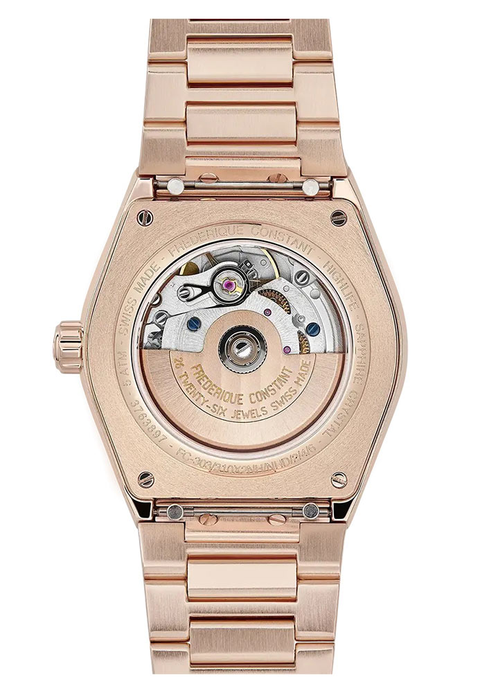 Model FC-310MPWD2NH4B byl vytvořen speciálně pro moderní ženy, které si vždy chtějí užít ladnost a eleganci. Pozlacené hodinky Frederique Constant jsou dostupné ve velikosti 34 mm s náramkem. Růžovo-zlaté hodinky zaujmou svým leskem a precizností zpracování. Na jeho zadní straně je krytka, která se připevňuje čtyřmi šrouby. Jeho průhledné okénko vám umožní obdivovat originální automatický strojek Frederique Constant FC-310 s rezervou chodu až 38 hodin. Je příkladem švýcarské kvality a preciznosti. Hodinky s plnou rezervou chodu umožňují přestávku v používání po dobu asi dvou dnů bez obav z zastavení mechanismu.