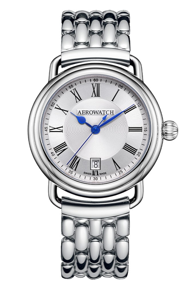 Švýcarská hodinářská značka Aerowatch představuje elegantní náramkové hodinky z kolekce 1942 , které vzdávají hold Maximu Crevoisierovi . Bylo to v roce 1942, kdy Maxim Crevoisier převzal otěže značky Aerowatch a byl to nový směr ve vývoji švýcarské společnosti. Prezentovaný model A 42900 AA26 M je kulaté pouzdro vyrobené z nerezové oceli ve stříbrné barvě. Na zaoblené uši byl připevněn elegantní stříbrný náramek. Náramek má bezpečné motýlkové zapínání. Na zadní straně pouzdra je ocelová záda pouzdra s logem značky Aerowatch. Na víku bude místo pro umístění rytiny. Na přední straně hodinek v prvním stupni se nachází safírové sklíčko, které je extrémně tvrdé a těžko se poškrábe. Safírové sklo chrání světlý ciferník, na kterém jsou elegantní modré ručičky, římské číslice a datumové okénko. Datum v 6 hodin ukazuje aktuální den v měsíci.