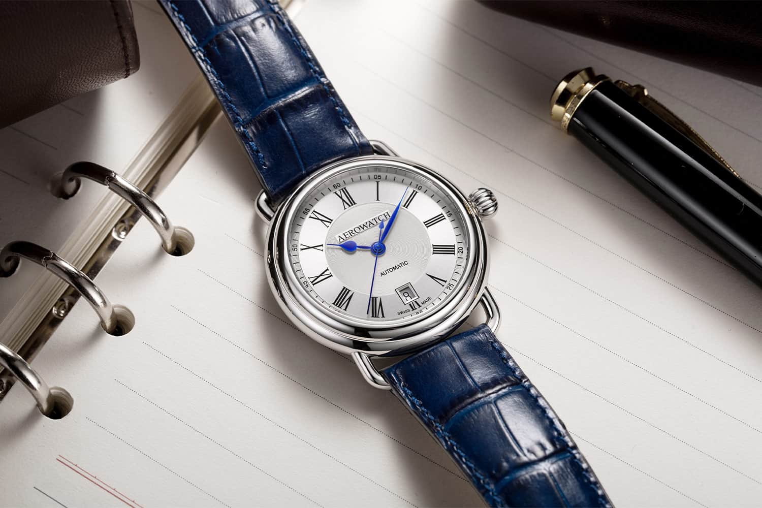 Aerowatch 1942 Automatic A 60900 AA26 jsou bezpochyby jedny z nejkrásnějších, klasických švýcarských hodinek. Retro design, kvalitní automatický Machineek a smysl pro dobrý vkus z něj dělají ideální nabídku pro moderního muže, který oceňuje pohodlí, eleganci a hodnoty švýcarského hodinářství. Ocelové pouzdro o průměru 40 mm má u tohoto modelu zaoblené výstupky pro připevnění modrého koženého řemínku. Korunka pro nastavení času také odkazuje na tvar klasického stylu, zaoblený, pohodlný na uchopení, zdobený charakteristickými drážkami. Pod tvrdým safírovým sklíčkem odolným proti poškrábání se skrývá světlý ciferník. Na ciferníku jsou elegantní modré ručičky, římské číslice a malé datumové okénko na 6. hodině.