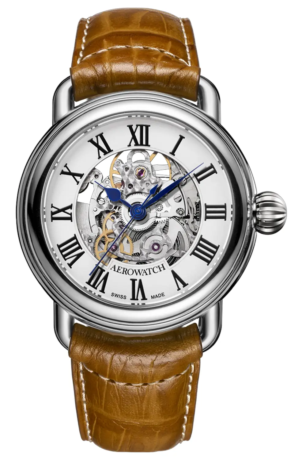 Model Aerowatch 1942 Automatic Skeleton A 60900 AA14 je příkladem nadčasového přístupu k pánskému designu, v němž každý detail plní funkci jak praktickou, tak estetickou. Harmonicky navržená konstrukce odhaluje vnitřek hodinek, čímž vytváří dojem lehkosti a zároveň zdůrazňuje mechanické srdce časomíry.