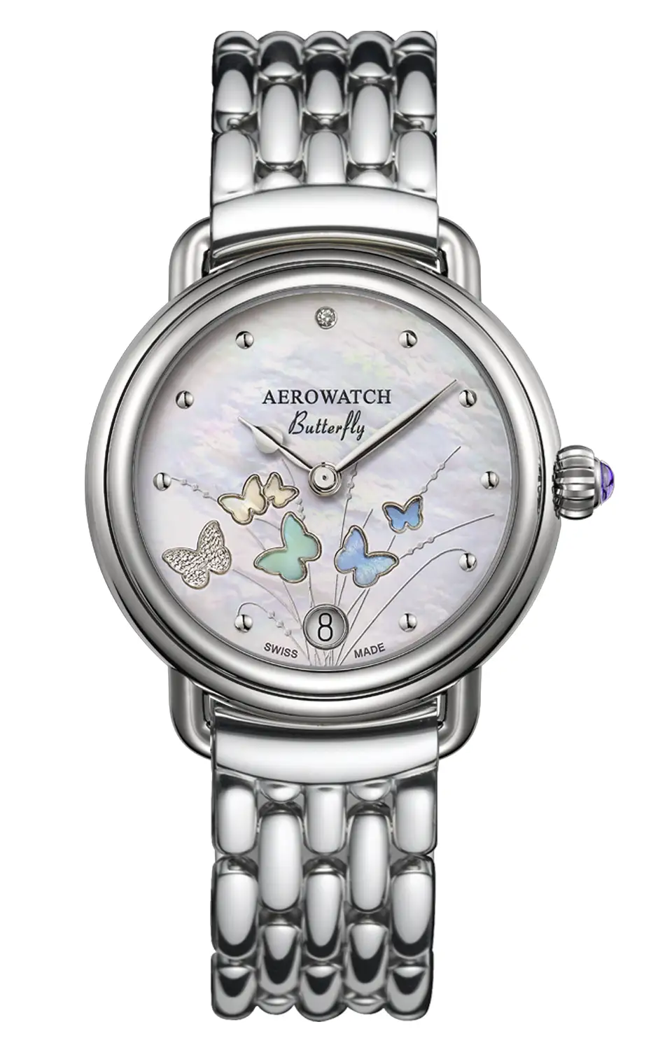 Aerowatch 1942 Butterfly Limited Edition A 44960 AA05 M je limitovanými dámskými hodinkami z kolekce inspirované lehkostí přírody a jemnou symbolikou motýlů. Edice omezená na 888 kusů po celém světě se vyznačuje perleťovým ciferníkem, na němž se jemné siluety motýlů mění v závislosti na pohybu zápěstí a úhlu dopadu světla.