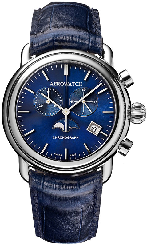 Aerowatch 1942 Chrono Quartz A 84934 AA05 jsou bezpochyby jedny z nejkrásnějších, klasických švýcarských hodinek. Přehledné indexy, gilošovaný ciferník, retro design, kvalitní quartzový Machineek s funkcí chronografu a fáze měsíce a smysl pro dobrý styl z něj dělají ideální nabídku pro moderního muže, který ocení pohodlí, eleganci a vyšší hodnoty. Pouzdro z leštěné oceli o průměru 42 mm ve vysokém lesku má zaoblené očka, které se používaly u hodinek vyráběných ve 40. letech 20. století Aerowatch 1942 Chrono Quartz jsou dokonalým společníkem nejen k obleku, ale i pro každodenní použití. Darováno jako dárek, zaujme dokonale provedenými detaily.