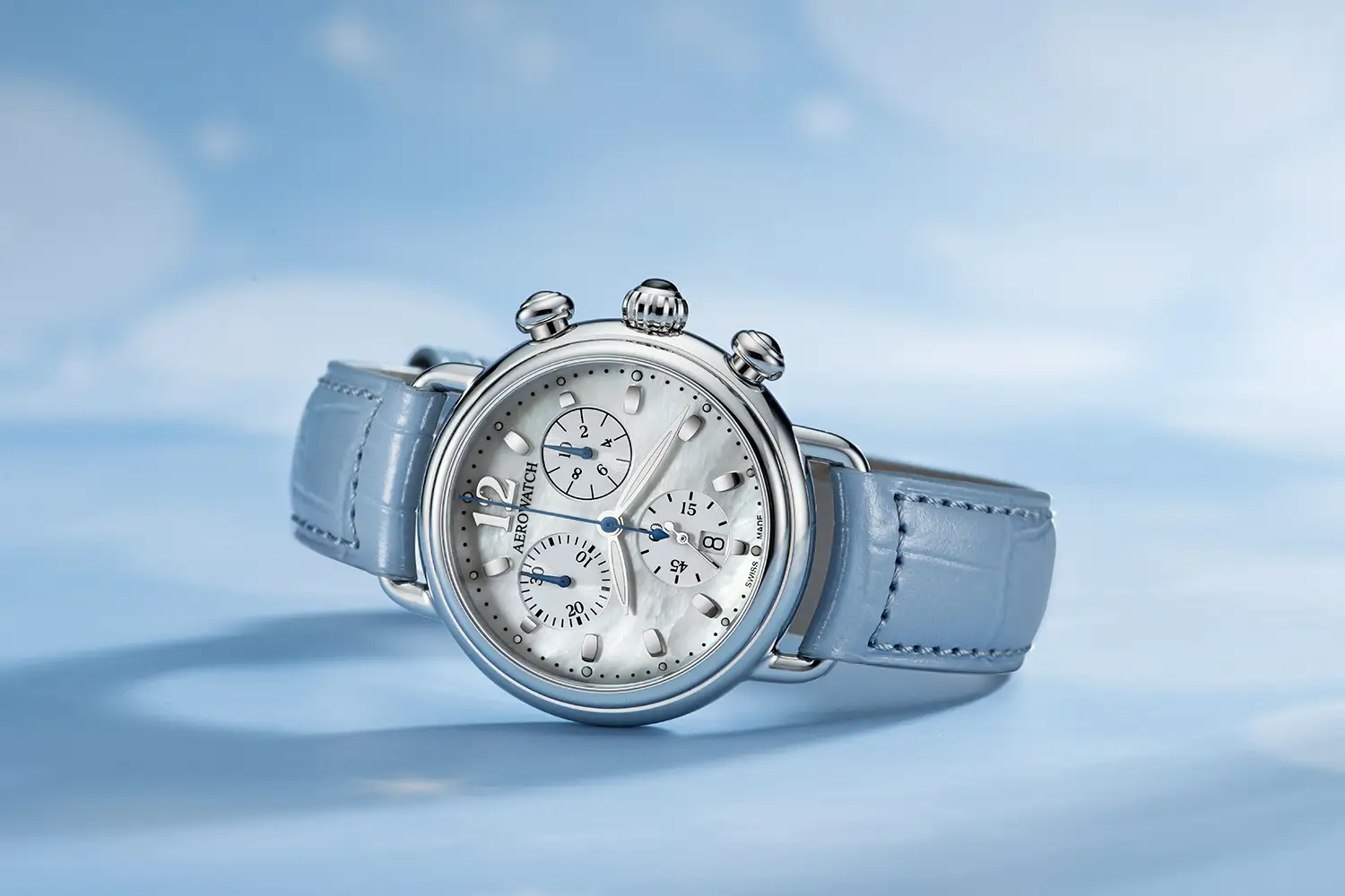 Aerowatch Chronolady 1942 Pastel Blue A 81105 AA01 je jemná, ženská interpretace klasického chronografu v pastelovém provedení. Světle modrý řemínek z přírodní kůže a modré detaily na číselníku vnášejí do celku svěžest a lehkost, ideální pro jarní a letní outfity. Tento model zaujme klidnou barevností a precizním zpracováním, aniž by ztrácel na funkčnosti.