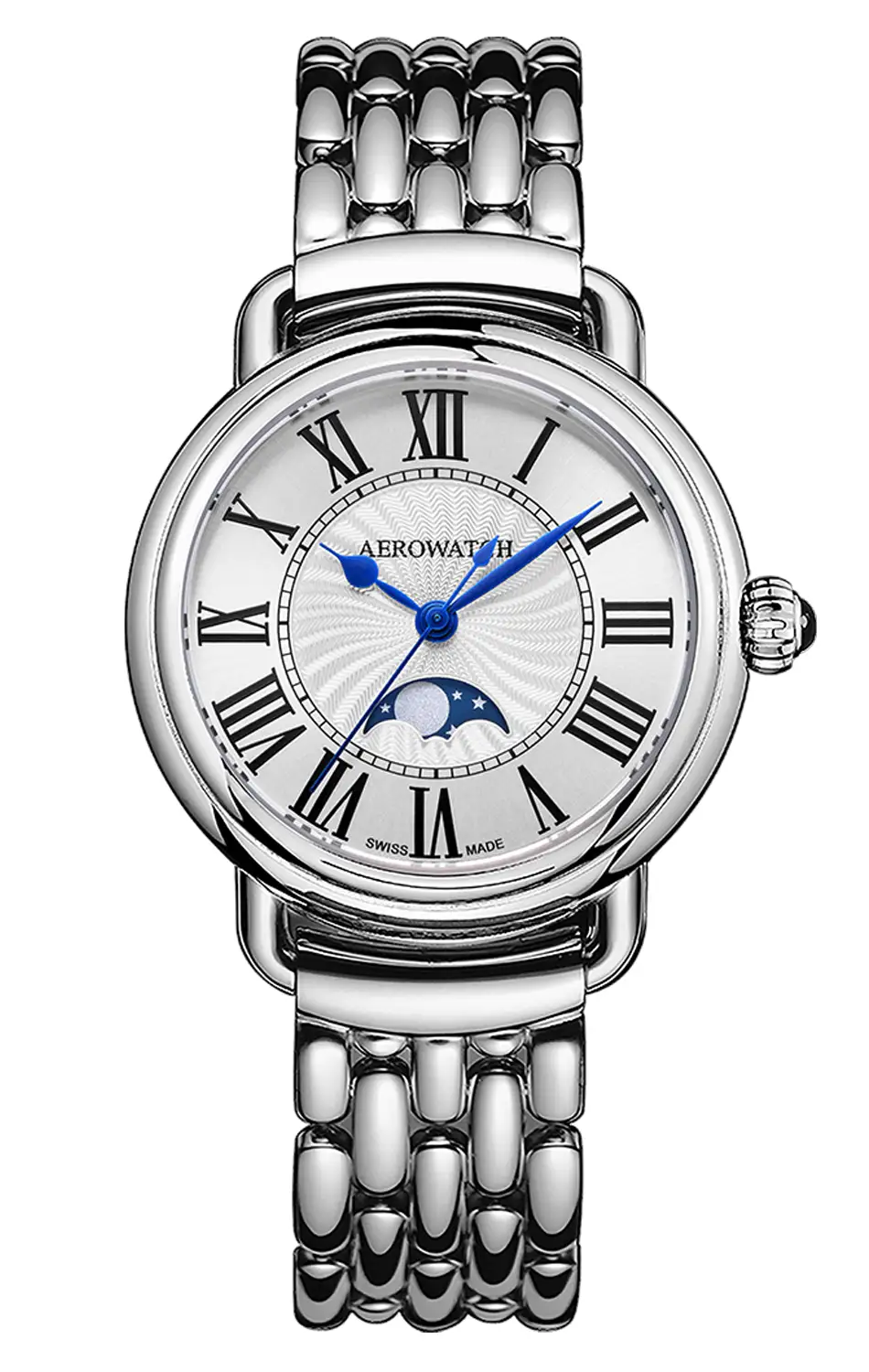 Aerowatch 1942 Elegance Moon Phase A 43960 AA03 M jsou dámské hodinky s elegantním profilem, inspirované kapesními hodinkami ze 40. let 20. století. Historické tvary jsou zde propojeny s moderními detaily a švýcarskou precizností. Světlý číselník zdobí dekorativní giloš a výrazný ukazatel měsíční fáze. Klasické římské číslice a modré ručky typu Breguet vytvářejí přehlednou a harmonickou kompozici, kterou chrání odolné safírové sklíčko.