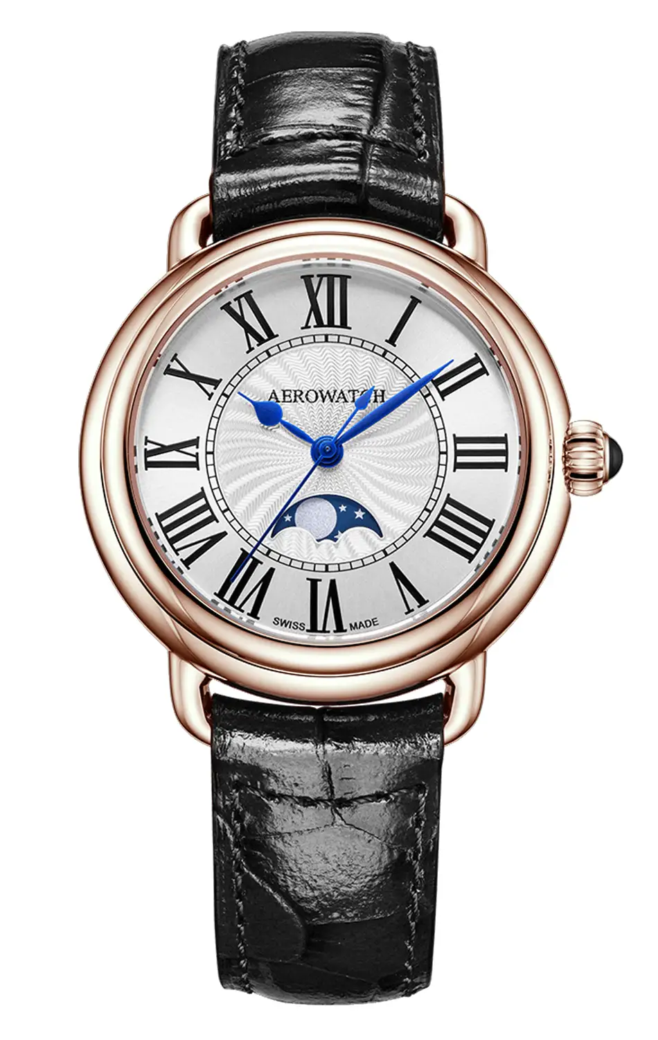 Aerowatch 1942 Elegance Moon Phase A 43960 RO03 jsou elegantní dámské hodinky s pouzdrem v odstínu růžového zlata a černým koženým řemínkem. Stylově nadčasový design odkazuje na tradici kapesních hodinek a dodává celku vytříbený vintage charakter v moderním provedení.
