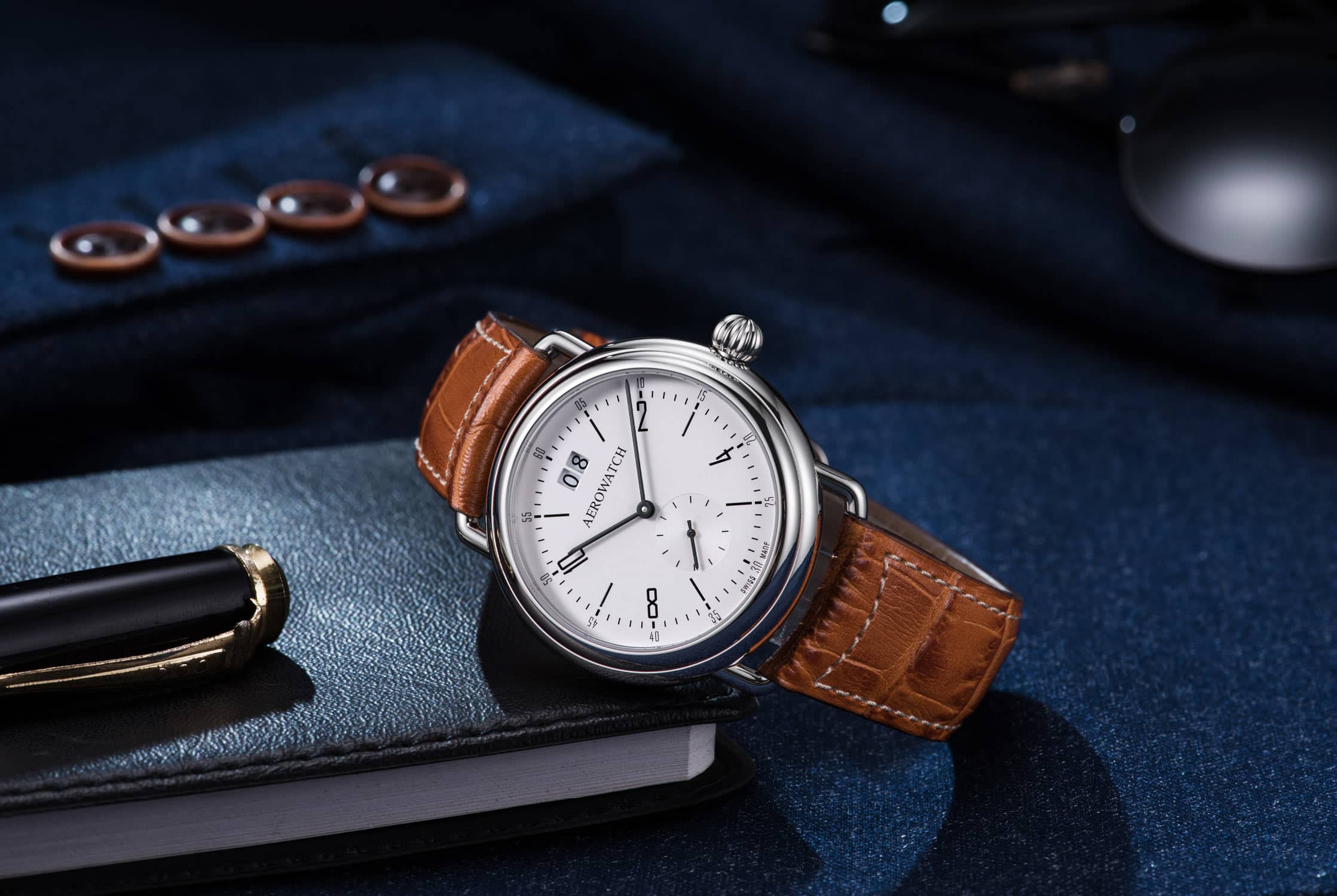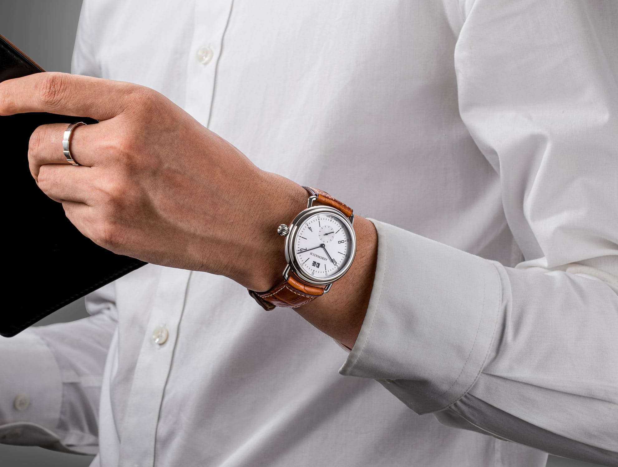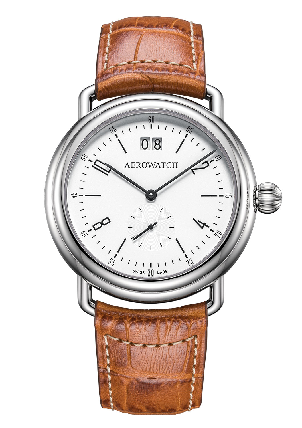 Ocelové pouzdro o průměru 40 mm, s zaoblenými ušima typickými pro čtyřicátá léta, se elegantně spojuje s koženým, světle hnědým páskem, což dodává celku jedinečný charakter. Korunka hodinek Aerowatch, rovněž v retro stylu, se vyznačuje ergonomickým, zaobleným tvarem a elegantními drážkami, které usnadňují její používání. Precizně zpracované indexy na stříbrném ciferníku, elegantně integrované s rámečkem datovníku na hodině 12 a jemně profilované ručičky, se dokonale hodí k celkovému designu. Ciferník s kombinovanými indexy je chráněn odolným proti poškrábání safírovým sklem.