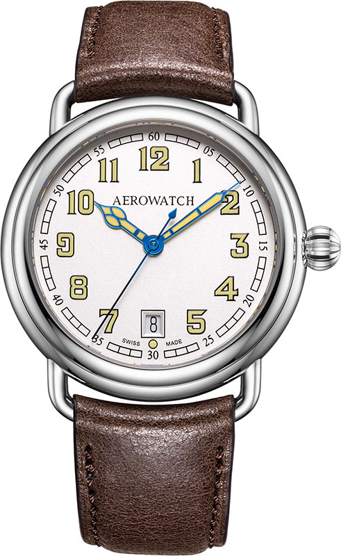 Aerowatch 1942 Gent Quartz A 42900 AA20 jsou bezpochyby jedny z nejkrásnějších, klasických švýcarských hodinek. Čiré arabské indexy naplněné luminiscenční látkou ve vintage žluté. Kvalitní bateriový Machineek quartz a smysl pro dobrý vkus z něj činí ideální nabídku pro moderního muže, který ocení pohodlí, eleganci a vysokou přesnost chůze. Ocelové pouzdro o průměru 40 mm má zaoblené očka pro uchycení koženého řemínku , které se používaly u hodinek vyráběných ve 40. letech 20. století. Ke klasickému stylu odkazuje i korunka pro nastavení času, zaoblená, příjemně se drží, zdobená charakteristickým drážky.