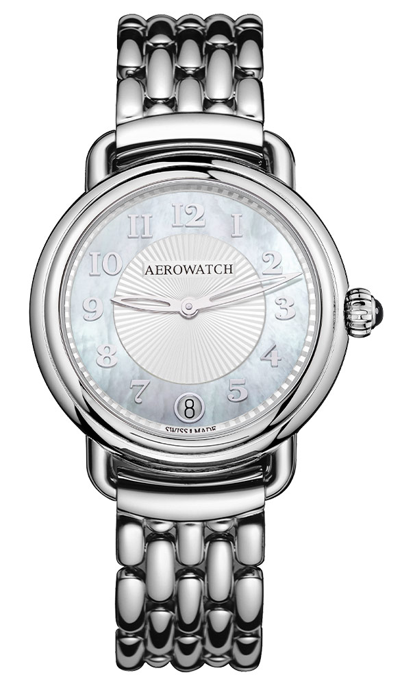 Dámské hodinky Aerowatch s referenčním číslem A 42960 AA19 M jsou kulaté ocelové pouzdro o průměru 35 mm ve stříbrné barvě. Perleťový ciferník chrání safírové sklíčko, které se extrémně těžko poškrábe. Na gilošovaném středovém ciferníku je datumové okénko na pozici šesté hodiny. Datumovka zobrazuje aktuální den v měsíci. Aktuální čas můžeme číst díky kostlivým rukám a arabským číslům. Na očka pouzdra je připevněn ocelový náramek stříbrné barvy s bezpečnou motýlkovou sponou.