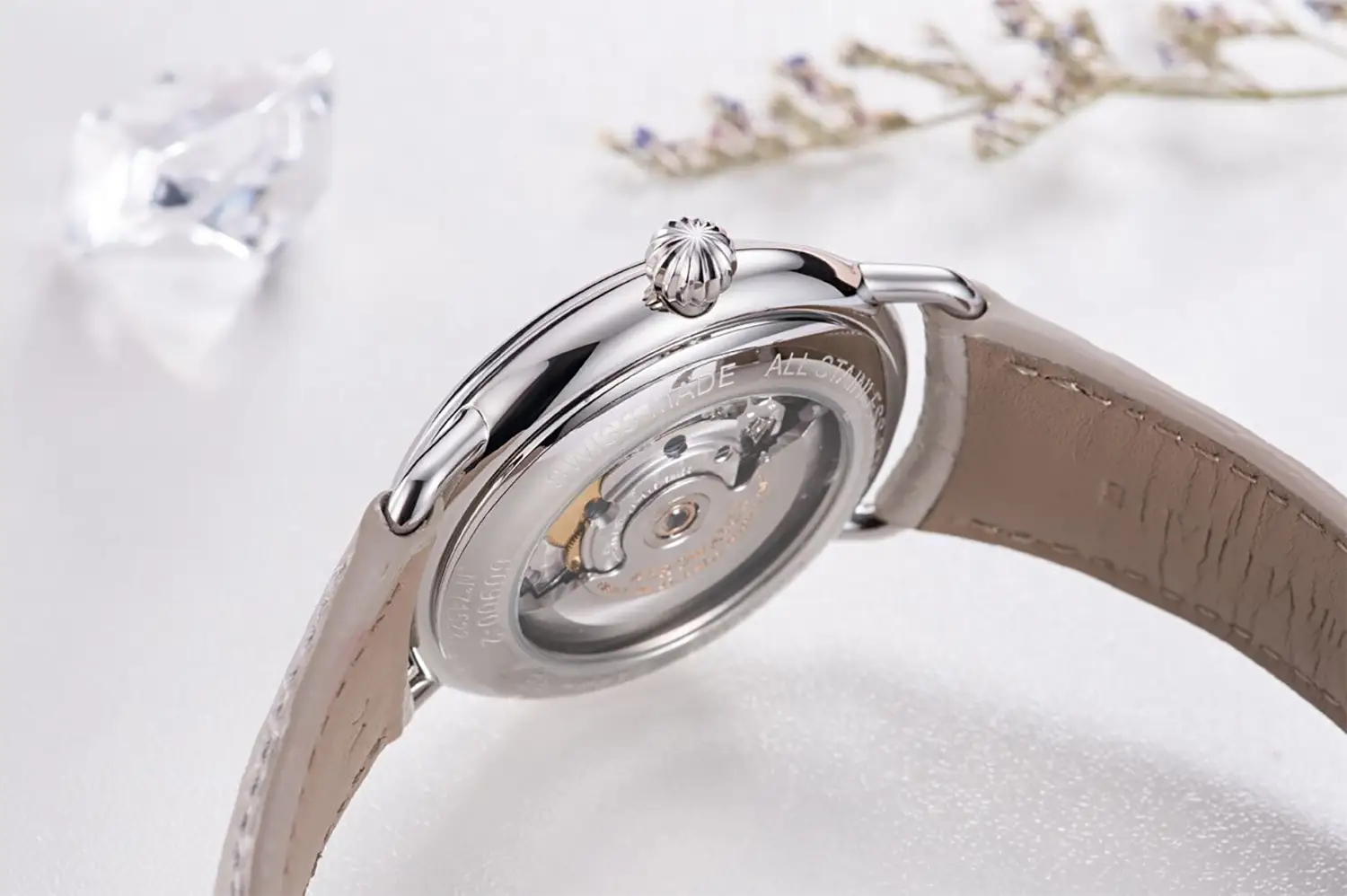 Stříbrný ciferník okouzlí detaily — paprskovitě se rozbíhajícím vzorem a centrálním dekoračním prstencem. Na pozici 12 je zasazen decentní modrý diamant, který slouží jako elegantní index a přitahuje pohled. Promyšlené uspořádání doplňuje úzký datumový ukazatel na šesté hodině. Hodinky mají 40mm pouzdro z ušlechtilé oceli, jehož měkké linie a leštěný povrch dokonale ladí s výjimečnou korunkou. Zezadu je model opatřen průhledným dýnkem, které umožňuje sledovat precizní práci strojku – detail pro milovnice hodinářského umění.