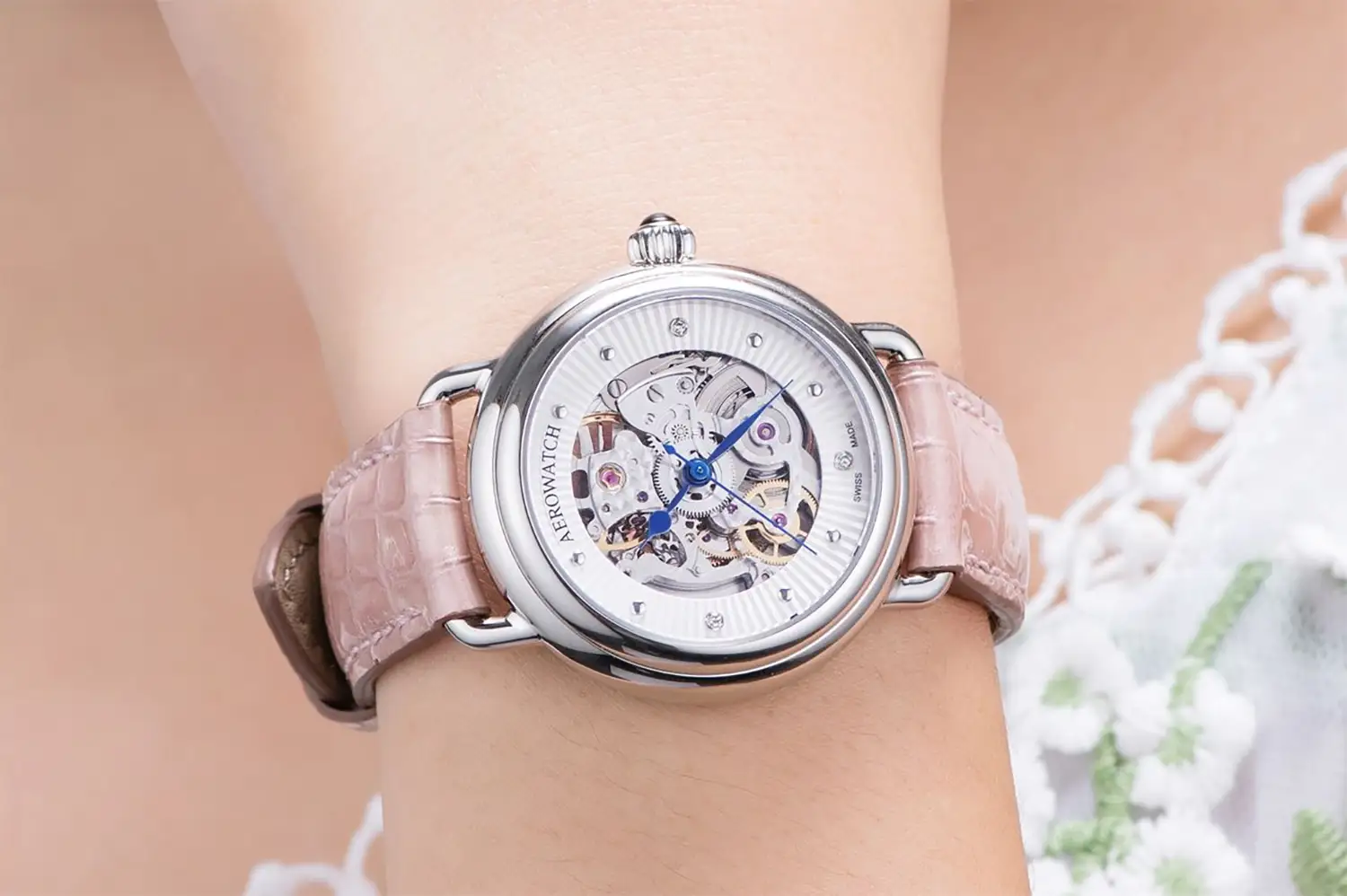Elegantní dámské hodinky Aerowatch 1942 Lady Automatic Skeleton A 60960 AA18 jsou určeny ženám, které si cení umění švýcarského hodinářství a osobitého stylu. Jejich skeletový číselník typu skeleton upoutá pozornost složitostí konstrukce a odhaluje precizní automatický strojek v celé své kráse.
