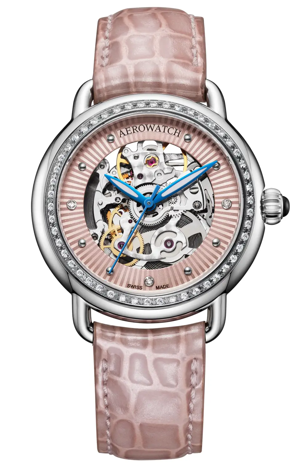 Exkluzivní dámské hodinky Aerowatch 1942 Lady Automatic Skeleton A 60960 AA20 DIA představují výjimečnou interpretaci klasického skeleton modelu v šperkové edici. Jejich charakteristický skeletový číselník v teplém odstínu lososové růžové odhaluje precizní švýcarský automatický strojek a vytváří jedinečný efekt hloubky a světla.