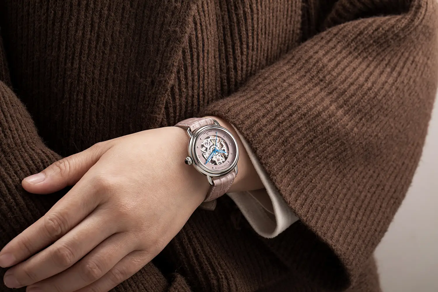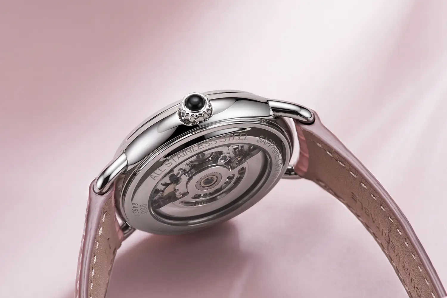 Leštěné pouzdro z ušlechtilé oceli má průměr 35 mm a pouhých 9,4 mm na výšku, což zaručuje pohodlné usazení hodinek na ženském zápěstí. Přední strana je chráněna safírovým sklem odolným proti poškrábání, zatímco průhledné dýnko na zadní straně umožňuje obdivovat chod automatického strojku s rezervou chodu až 38 hodin. Čas ukazují klasické modré ručky a místo klasických indexů jsou použity jemné stříbrné značky doplněné o tři diamanty, které dodávají číselníku decentní lesk. Celek završuje růžový řemínek z přírodní kůže s krokodýlí texturou, zakončený elegantní motýlkovou sponou.