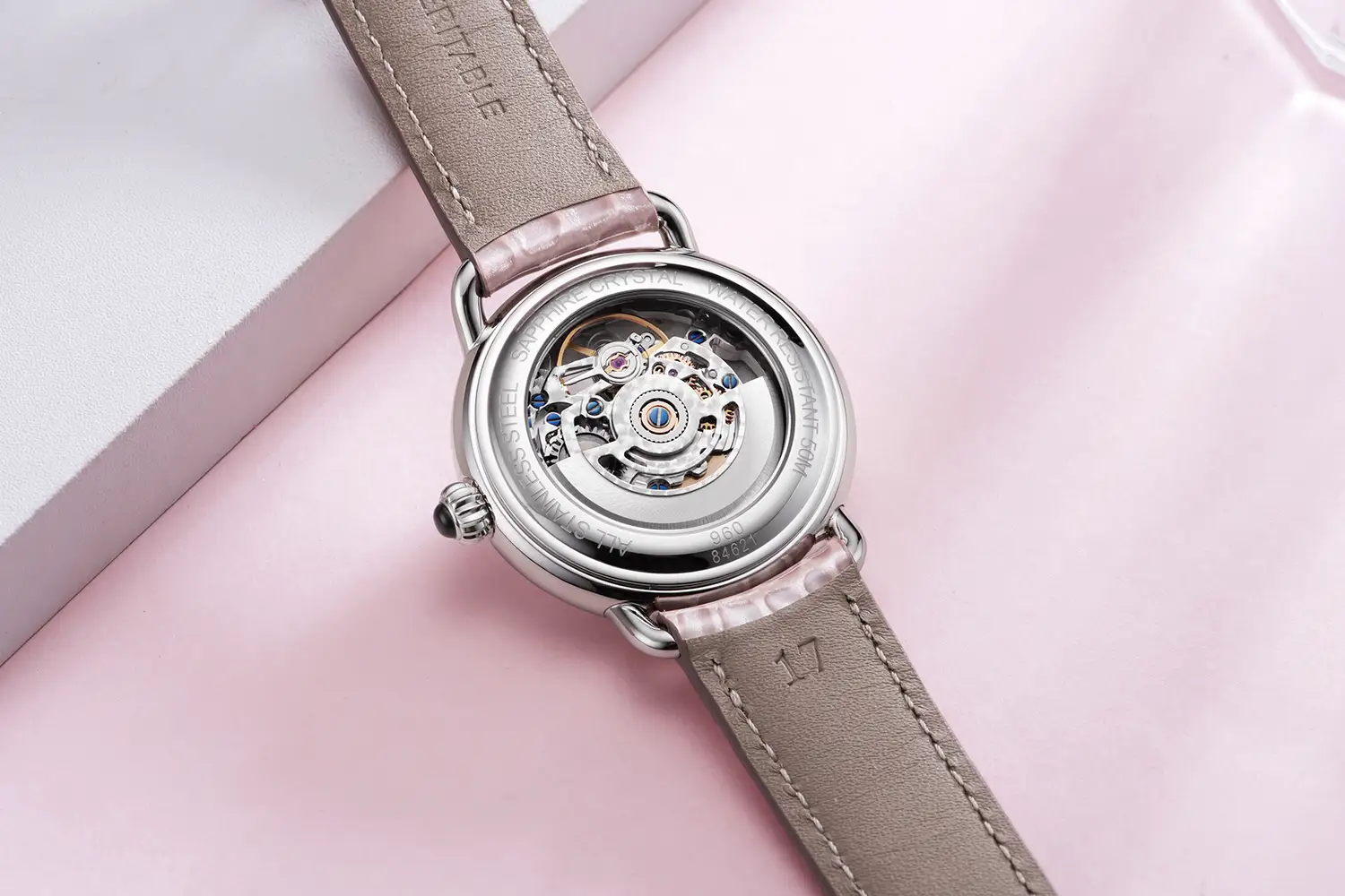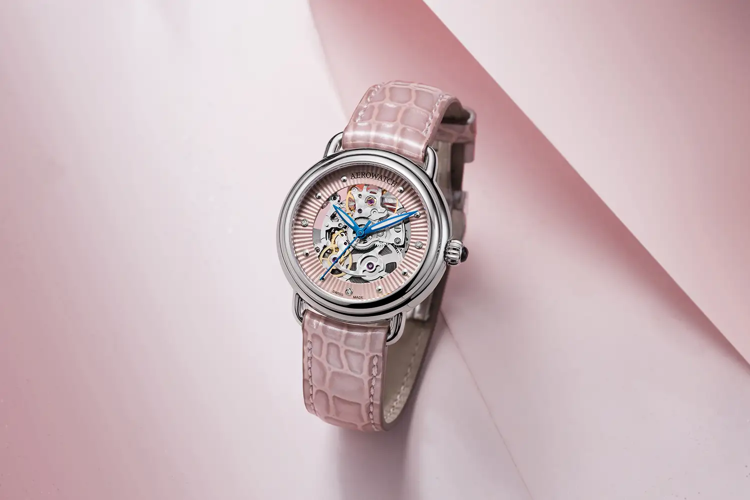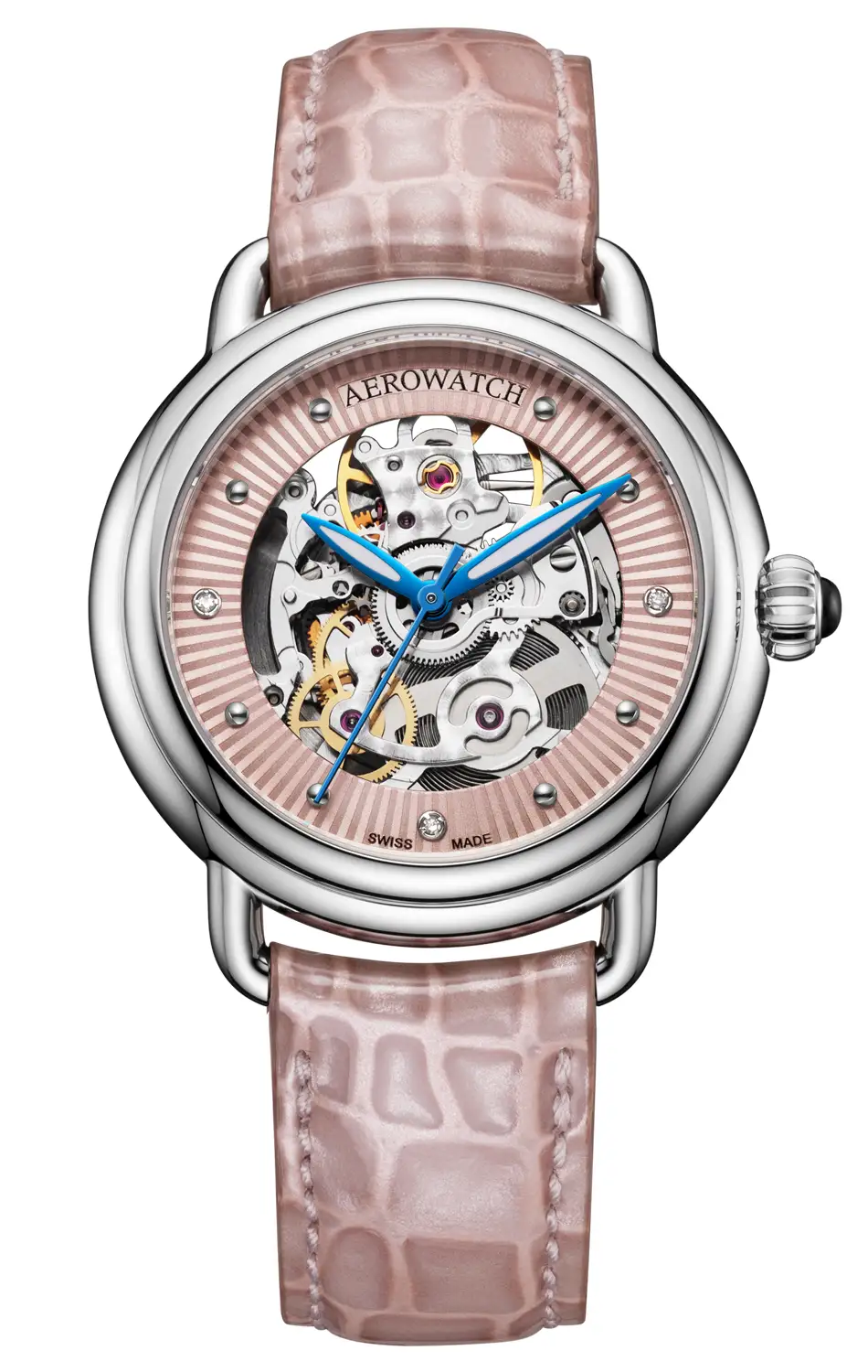 Elegantní dámské hodinky Aerowatch 1942 Lady Automatic Skeleton A 60960 AA20 představují vytříbené spojení švýcarské preciznosti a ženské jemnosti. Model vyniká skeletovým číselníkem typu skeleton, který v této verzi získal jedinečné provedení v odstínu lososové růžové. Toto barevné ladění přináší teplo, lehkost a něhu, aniž by ustupovalo hodinářskému charakteru konstrukce.