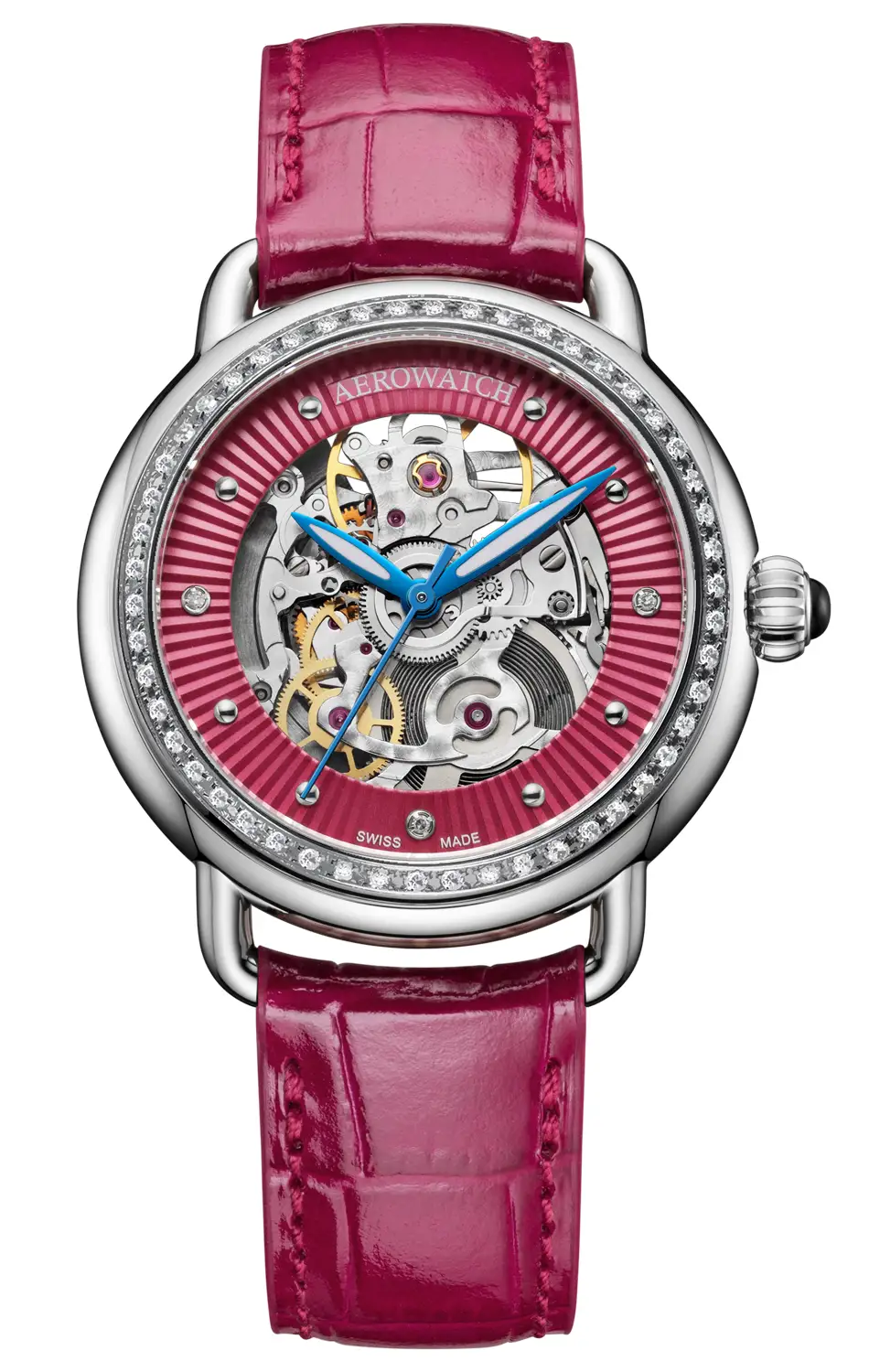 Aerowatch 1942 Lady Automatic Skeleton A 60960 AA21 DIA jsou exkluzivní dámské hodinky, které spojují výrazný styl s klenotnickým luxusem. Bordó skeleton číselník v odstínu tmavé růžové upoutá pozornost svou hloubkou a odhalením precizního švýcarského automatického strojku. Toto jedinečné spojení barevnosti a technického mistrovství propůjčuje hodinkám neopakovatelný charakter.