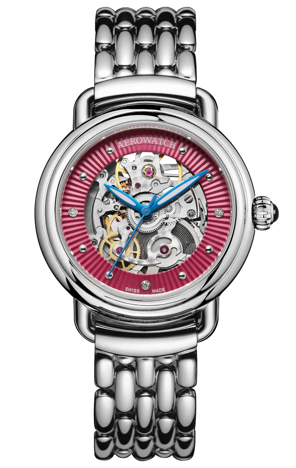 Aerowatch 1942 Lady Automatic Skeleton A 60960 AA21 M jsou výrazné a elegantní dámské hodinky, které spojují švýcarskou preciznost s hlubokou bordó barevností. Skeletový číselník v odstínu tmavé růžové odhaluje složitost automatického strojku a umožňuje obdivovat jeho dynamickou strukturu a hodinářské detaily v plném světle.
