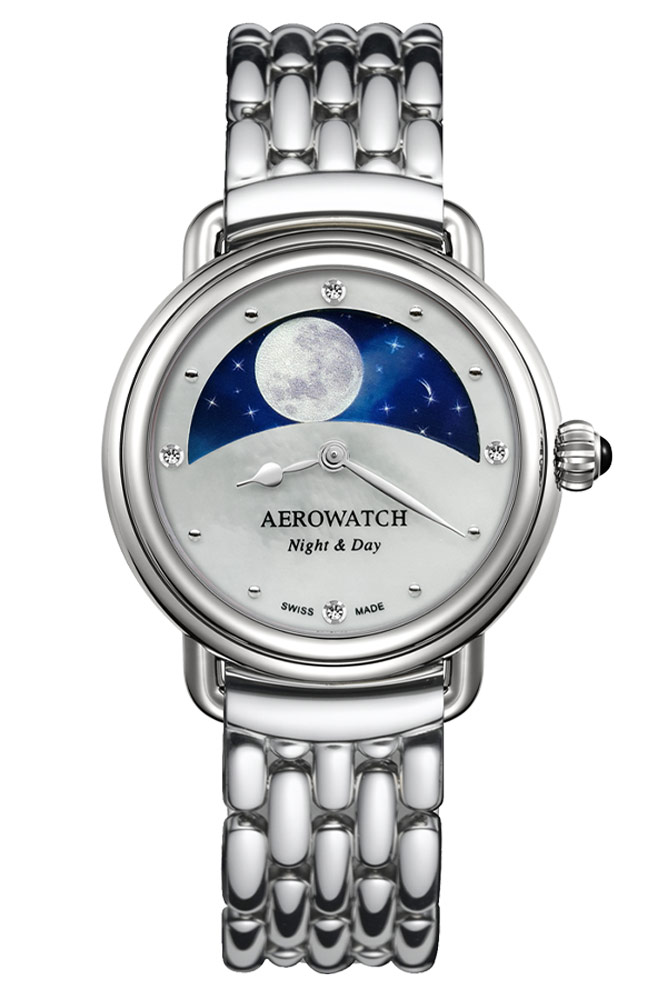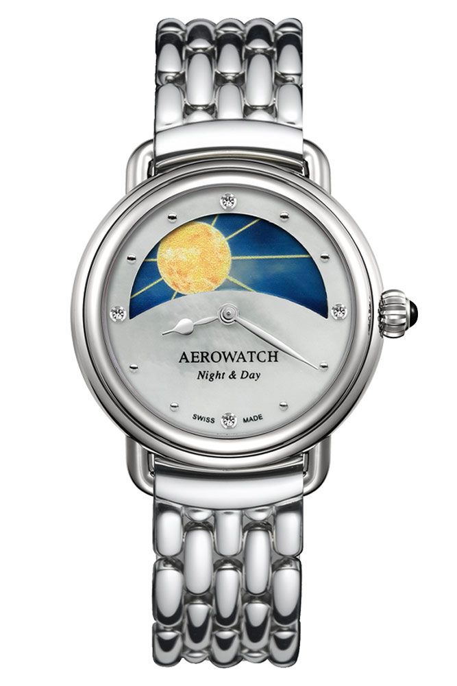 Aerowatch A 44960 AA11 M má elegantní pouzdro z nerezové oceli, leštěné do vysokého lesku a má průměr 35 mm. Co upoutá pozornost, je krásně zdobený perleťový ciferník se 4 osazenými diamanty na pozicích 12, 3, 6 a 9 hodin. V horní polovině ciferníku, chráněného odolným safírovým sklem, umístil Aerowatch indikátor dne a noci. Otáčivý ciferník vypadá úžasně a dodává hodinkám velký šarm. Den je znázorněn ve formě zářícího slunce a noc ve formě měsíce se třpytivými hvězdami, a to vše na pozadí z perleti. Na pravé straně pouzdra se nachází velká korunka s ozdobným kamenem v barvě noci. Aerowatch 1942 Night & Day je spárován s pohodlným ocelovým náramkem stříbrné barvy s motýlovým zapínáním.