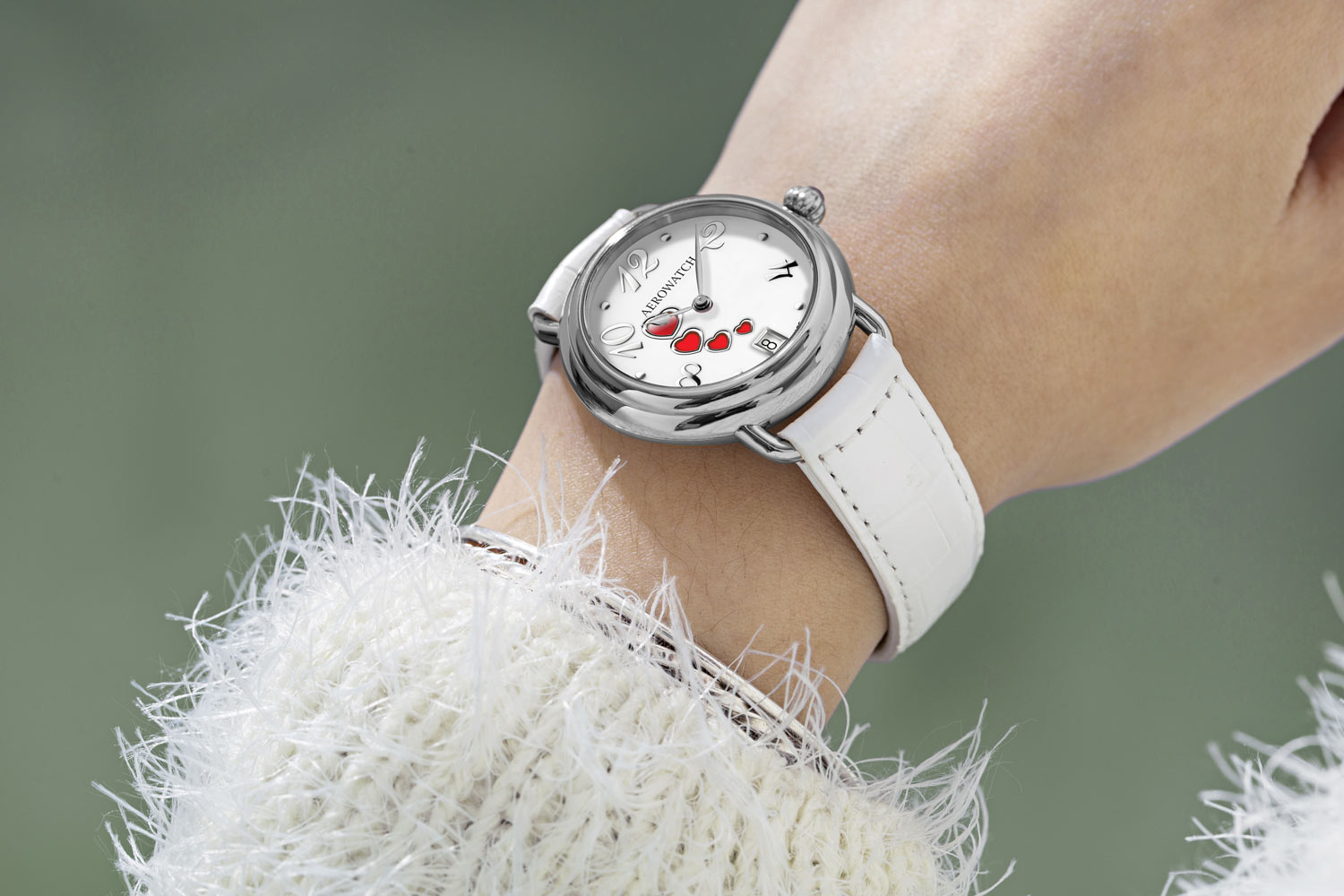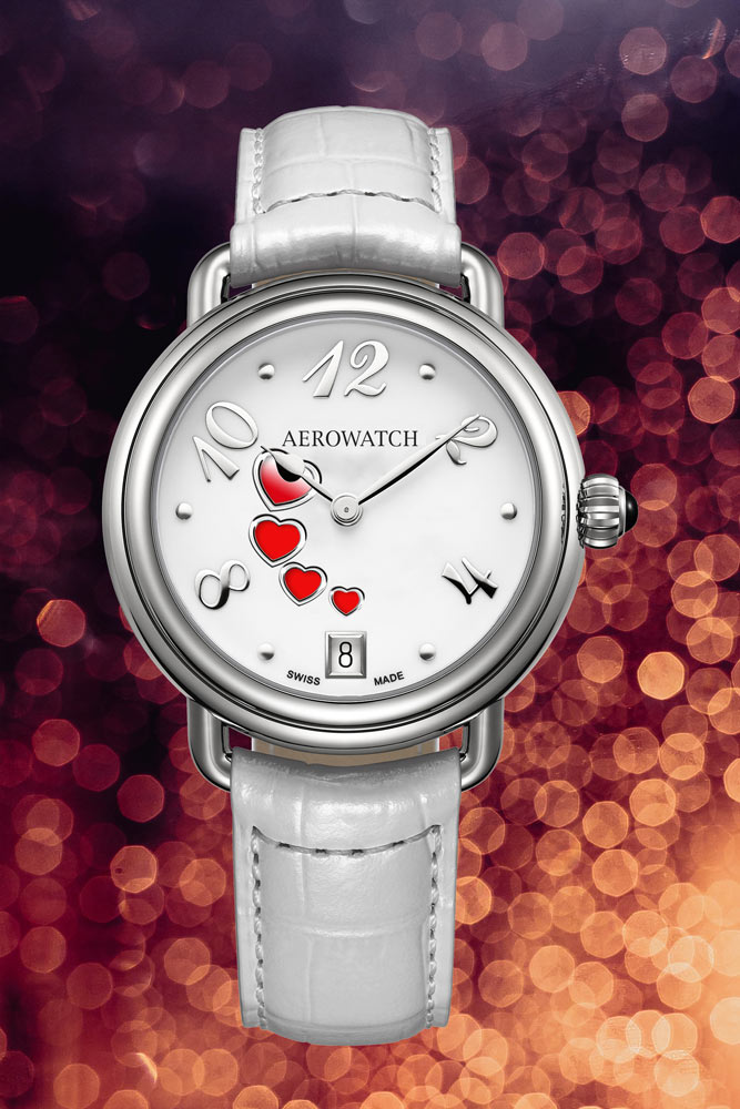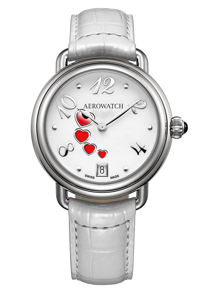 Kulaté pouzdro o průměru 35 mm působí mimořádně harmonicky a jeho unikátní zdobení v podobě čtyř srdíček na bílém ciferníku dodává hodinkám romantický charakter. Celek doplňuje měkký a na dotek příjemný bílý kožený řemínek, který dokonale ladí s jemným designem. Tyto hodinky odrážejí nejen preciznost švýcarského hodinářství, ale také zapadají do estetiky ženské elegance.
