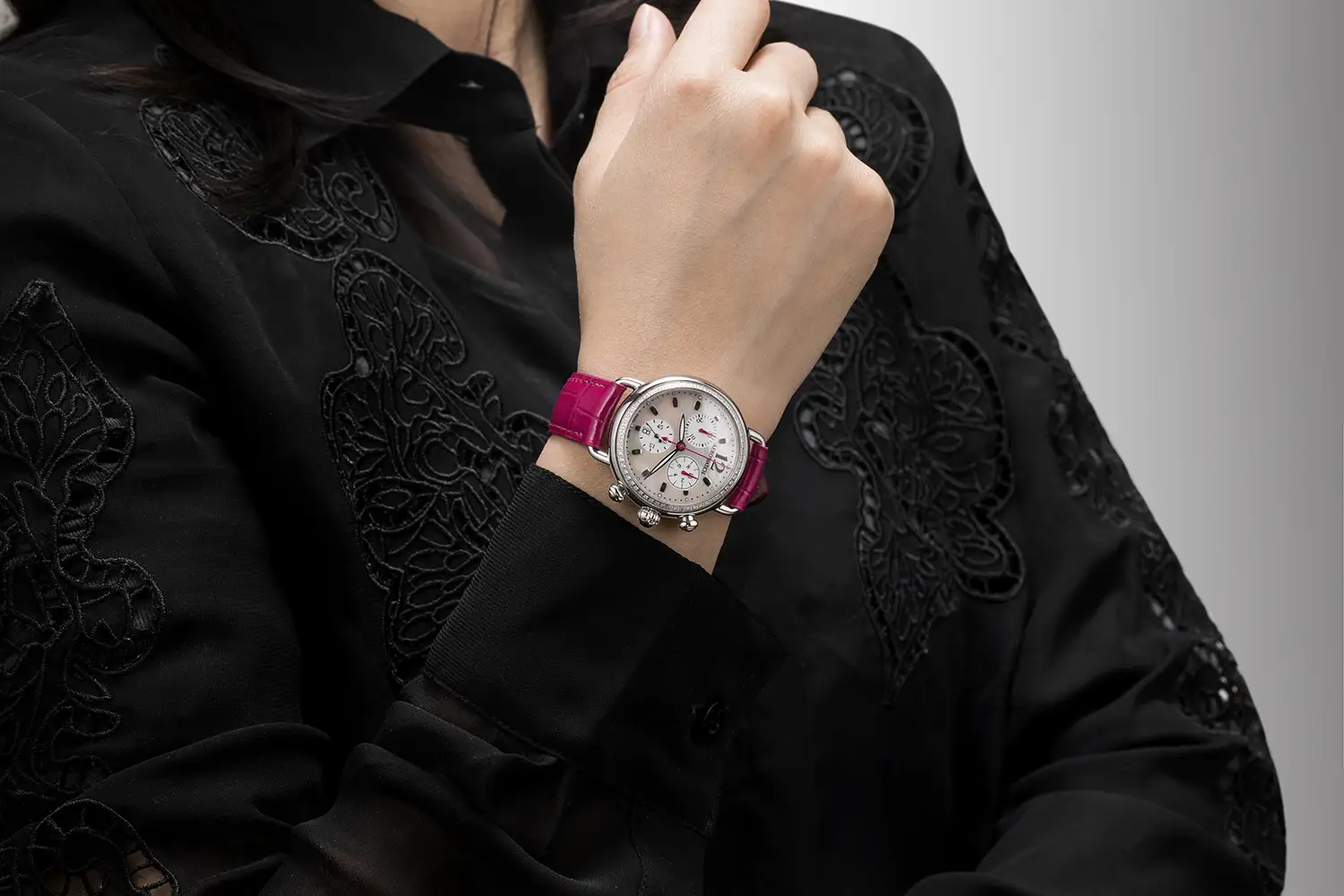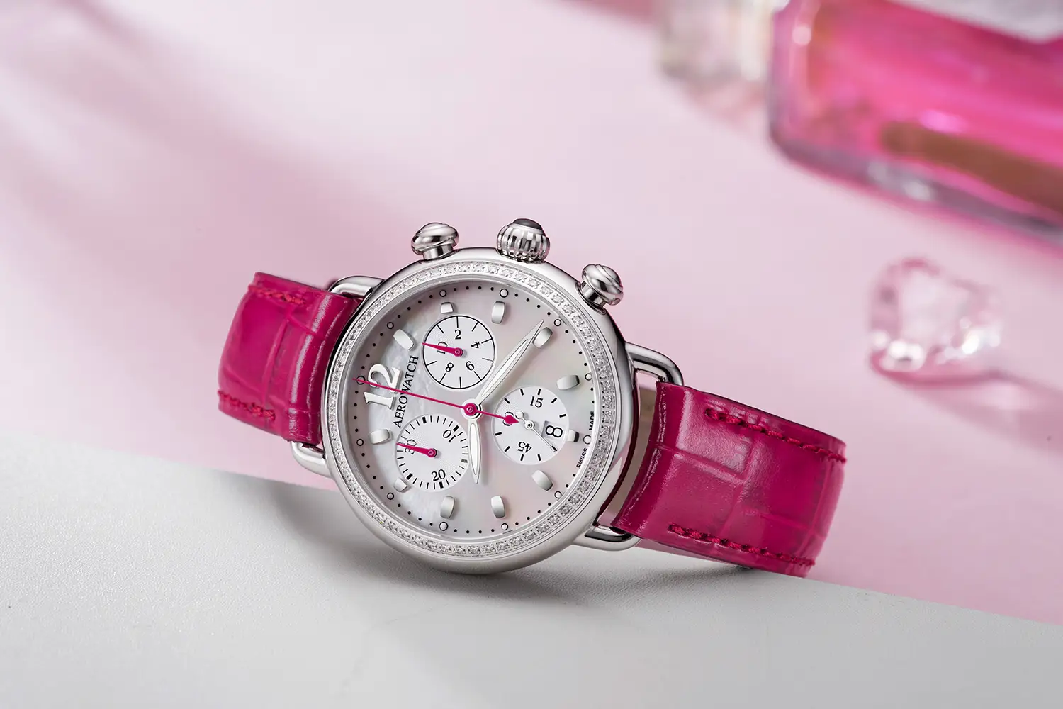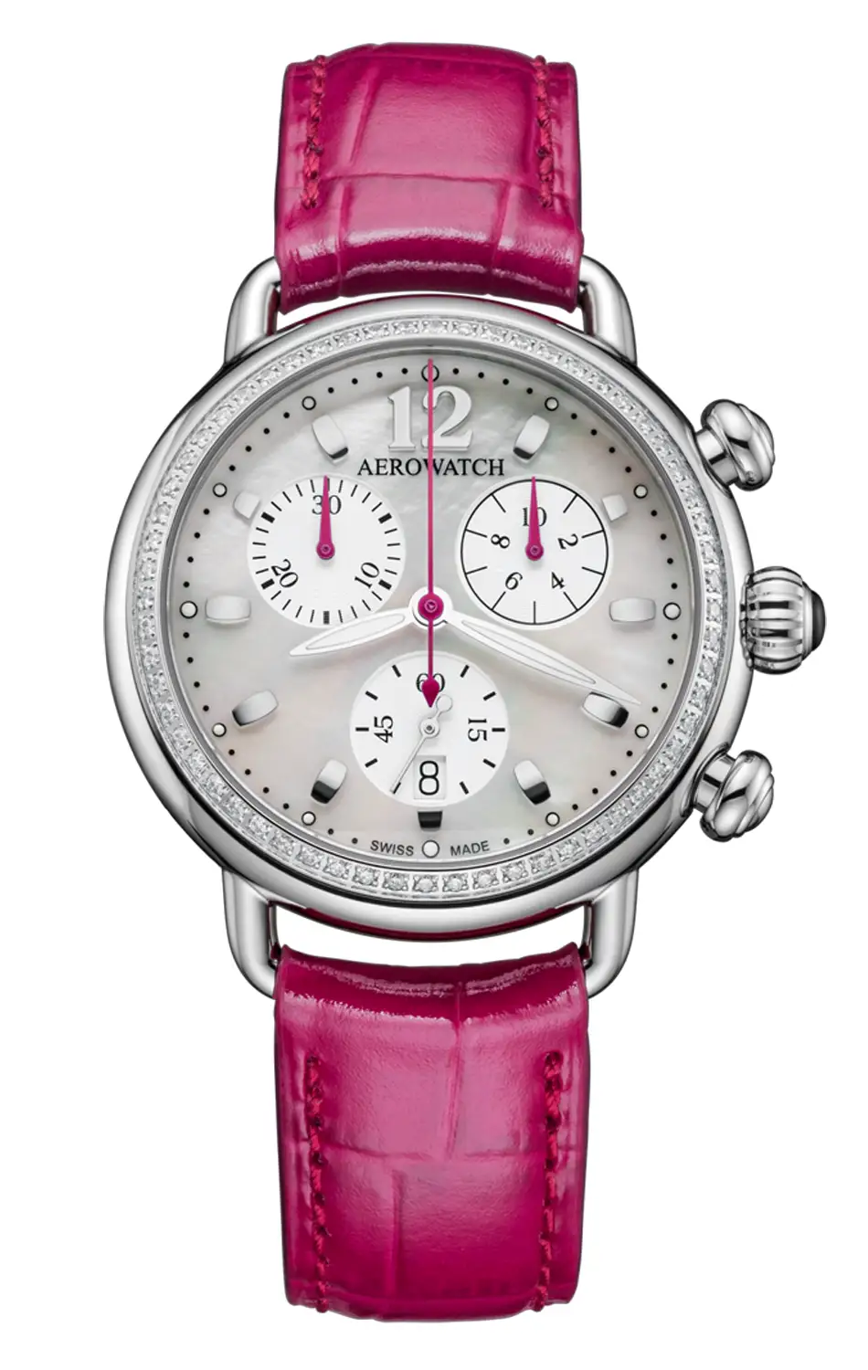 Aerowatch Chronolady 1942 Raspberry A 81105 AA04 DIA je spojením intenzivní barvy s jemným třpytem diamantů, které celému modelu dodávají vytříbený charakter. Luneta pouzdra je osazena 60 laboratorně vypěstovanými diamanty v briliantovém brusu – jejich jemné odlesky harmonicky ladí s perleťovým číselníkem a sytým malinovým řemínkem.