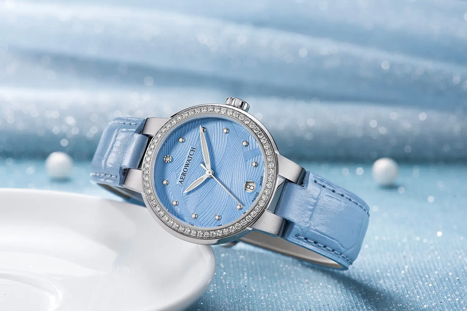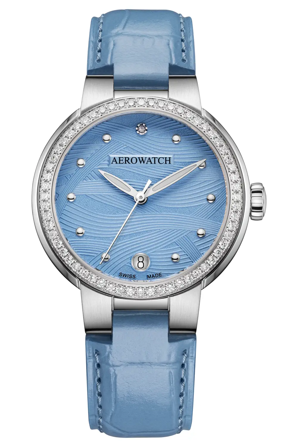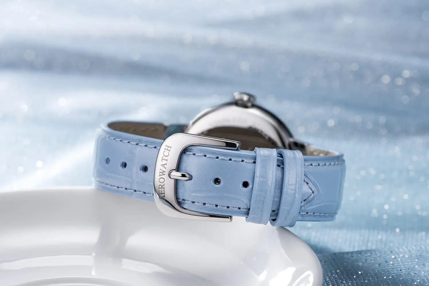 Celý celek završuje safírové sklíčko s antireflexní vrstvou, které zdůrazňuje trojrozměrnou strukturu číselníku a chrání jej před poškrábáním. Hodinky jsou vybaveny světle modrým koženým řemínkem s jemnou texturou, který podtrhuje ženský styl a dodává modelu lehkost. Řemínek je zakončen klasickou ocelovou sponou, která umožňuje přesné přizpůsobení zápěstí a zajišťuje pohodlné nošení. Nad pozicí 6 hodin se nachází přehledná datumovka. Tento model Aerowatch je spojením funkčnosti, vytříbené estetiky a luxusu – ideální pro ženy, které volí doplňky zdůrazňující individualitu a třídu.