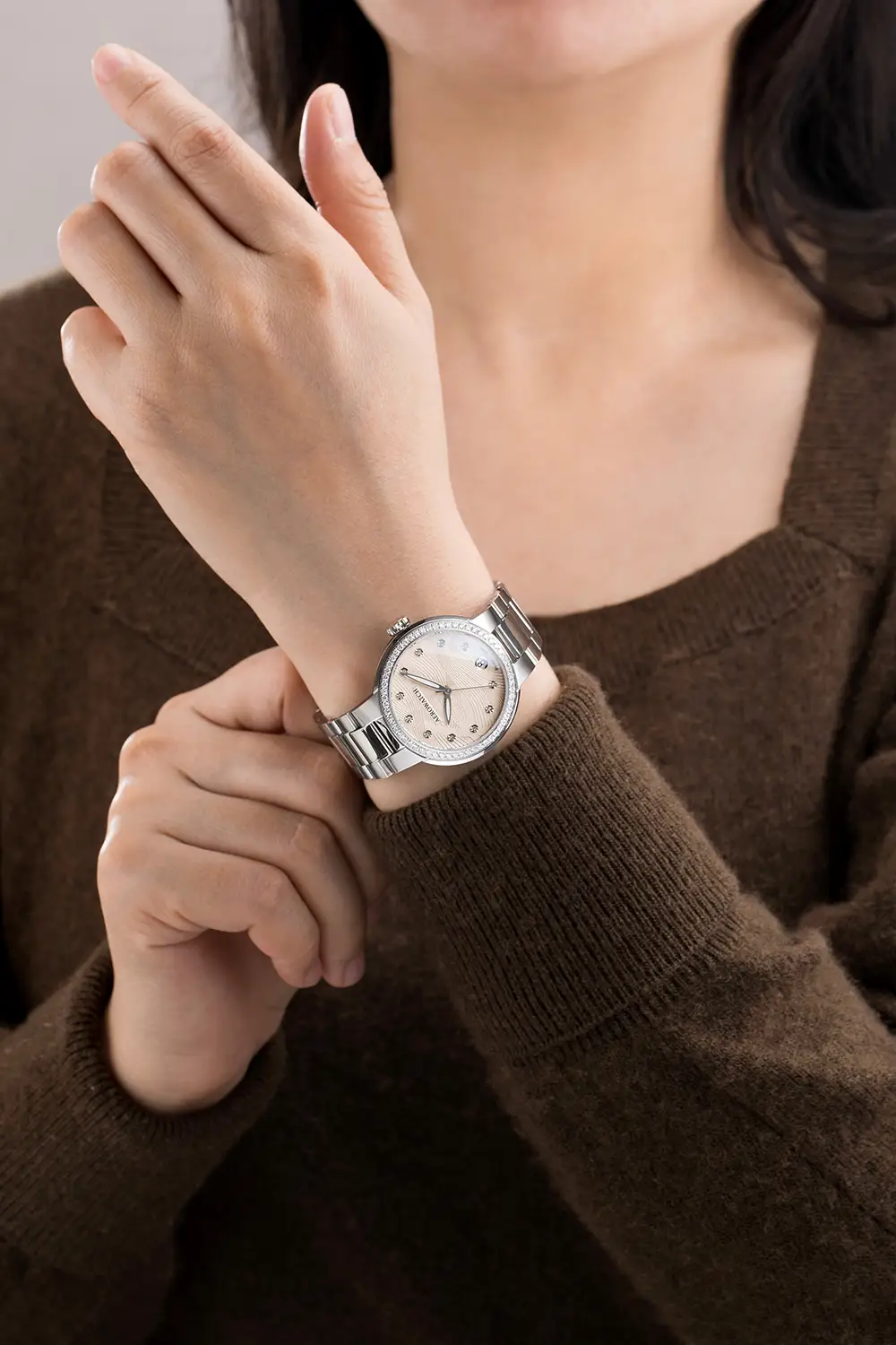 Pouzdro o průměru 35 mm je vyrobeno z leštěné ušlechtilé oceli, přičemž saténová úprava nožek dodává hodinkám ušlechtilý charakter. Na lunetě je vsazeno 60 diamantů čistoty VS o celkové hmotnosti 0,84 ct v briliantovém výbrusu, které dodávají celku lesk a dojem exkluzivity. Krémový číselník je ozdoben jemným vzorem „Snow Lines“, připomínajícím ledové struktury nebo rozptýlené světlo na matném povrchu. Funkci indexů plní 11 diamantů, pečlivě zasazených kolem číselníku – každý z nich přináší šperkařský lesk a zároveň zachovává přehlednost kompozice.
