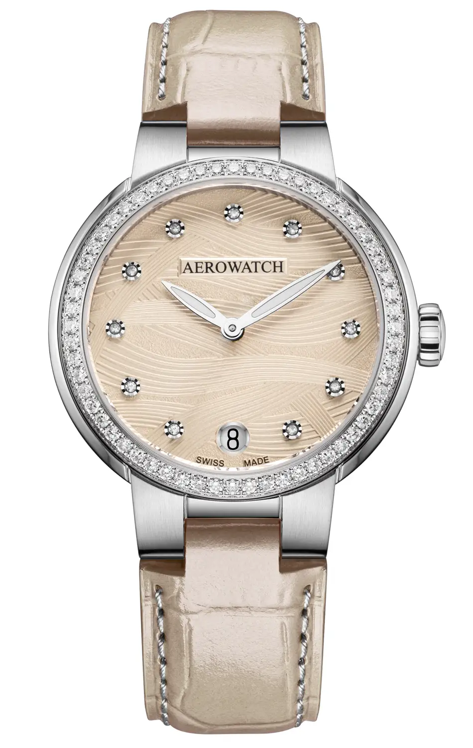 Celý model chrání vypouklé safírové sklíčko s antireflexní vrstvou, které zajišťuje ochranu číselníku před poškrábáním a zvýrazňuje jeho trojrozměrnou strukturu. Kožený řemínek v krémovém odstínu barevně ladí s číselníkem a přidává hodinkám lehkost, zatímco jeho jemná textura dodává modelu měkký a útulný charakter. Zakončený ocelovou sponou umožňuje pohodlné přizpůsobení zápěstí. Na pozici 6 hodin se nachází přehledná datumovka – praktický a elegantní detail. Aerowatch Harmonie A 42107 AA02 DIA je spojením světla, tvaru a detailů – ideální volba pro ženy, které hledají časomíru s třídou, ale bez okázalosti.