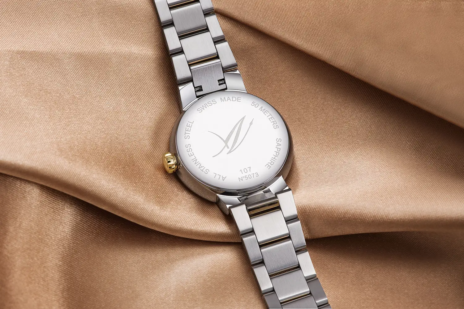 Robustní pouzdro o průměru 35 mm je vyrobeno z vysoce kvalitní ušlechtilé oceli, jeho hladké linie a výrazná korunka podtrhují charakter kolekce 1942. Model je vybaven špičkovým safírovým sklem odolným proti poškrábání a průhledným dýnkem, které umožňuje obdivovat práci renomovaného automatického strojku ETA 2824-2.