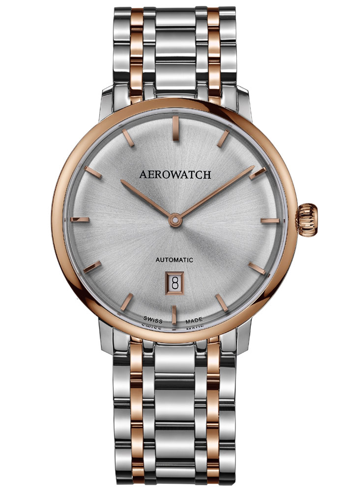 Klasické pánské hodinky Aerowatch Heritage Slim Automatic A 67975 BI01 M jsou elegantním modelem, který dokonale ladí s košilí i oblekem. Tenké pouzdro o průměru 40 mm a tloušťce pouhých 9,18 mm je vyrobeno z odolné nerezové oceli, která zaručuje pohodlné nošení a snadné schování hodinek pod manžetou košile bez rizika poškození materiálu. I přes své kompaktní rozměry vypadají hodinky větší díky stříbrnému, jemně zahnutému ciferníku s pozlacenými indexy, obklopenému elegantním pozlaceným prstenem.