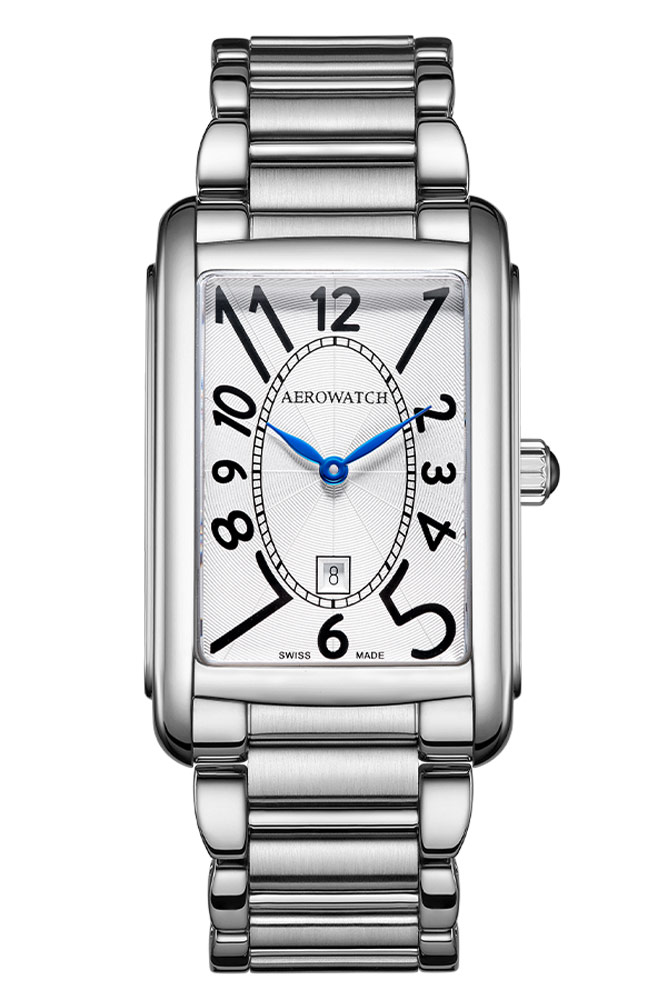 Švýcarská značka Aerowatch představuje hodinky z kolekce Intuition Lady. A 49988 AA04 M jsou obdélníkové hodinky vyrobené z nerezové oceli. Pouzdro 35,00 mm x 27,50 mm má elegantní povrchovou úpravu a potěší oko každé ženy. Na pravé straně pouzdra je krajka zdobená kamenem onyx. Pod safírovým sklíčkem s vysokou odolností proti poškrábání díky vysoké tvrdosti se nachází světlý ciferník. Ciferník je bílý a vyznačuje se velkými, dobře čitelnými arabskými číslicemi a modrými ručičkami. Malý datumovka bude pravděpodobně užitečný doplněk. Okno v 6 hodin ukazuje aktuální den v měsíci. Na očka pouzdra je připevněn ocelový náramek s bezpečnou motýlkovou sponou.