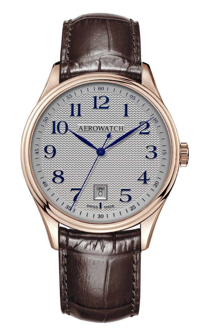 Štíhlé, elegantní ručičky vynikají na stříbrném ciferníku zdobeném jemným guilloché vzorem, který podtrhuje sofistikovaný styl hodinek. Praktický datový ukazatel, nenápadně umístěný na pozici 6, se harmonicky začleňuje do celkové kompozice ciferníku. Centrální část ciferníku s jemným guilloché zdobením přidává hloubku a elegantní strukturu, díky čemuž je tento model výjimečný po estetické stránce. Pánský hodinky Aerowatch A42102RO05 pohání přesný švýcarský quartzový strojek, který zaručuje spolehlivost a vynikající přesnost.