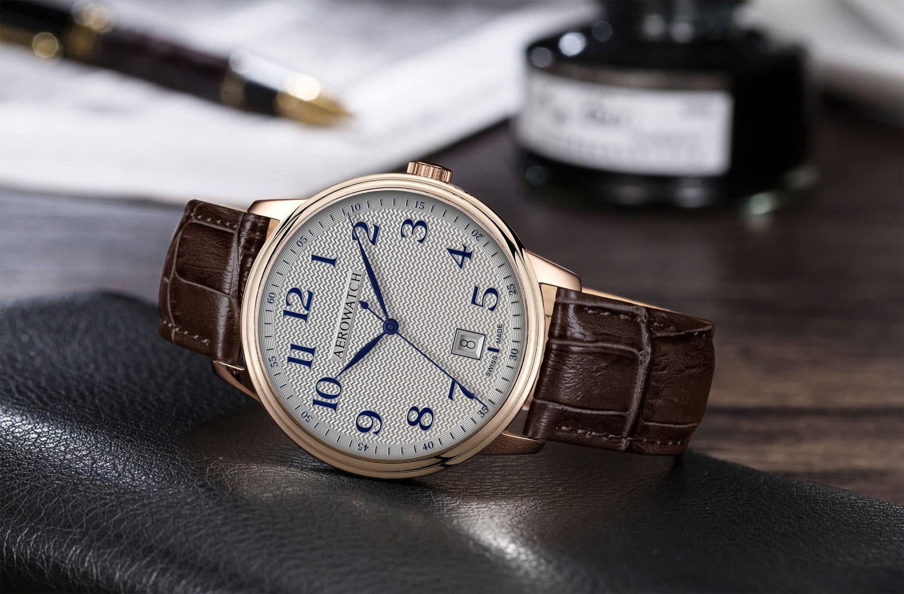 Švýcarský hodinky Aerowatch A-42102-RO05 se vyznačují 40mm pouzdrem z leštěné nerezové oceli, která je pokryta růžovo-zlatou PVD vrstvou. Tento prvek jim dodává elegantní a luxusní charakter. Leštěný povrch zdůrazňuje sofistikovaný design tohoto modelu, což z něj činí ideální volbu pro ty, kteří oceňují styl a třídu. Tento časoměřič Aerowatch je doplněn hnědým řemínkem z přírodní kůže, který díky výrazné textuře dodává hodinkám klasický šarm, zatímco zároveň zajišťuje pohodlí při každodenním nošení.
