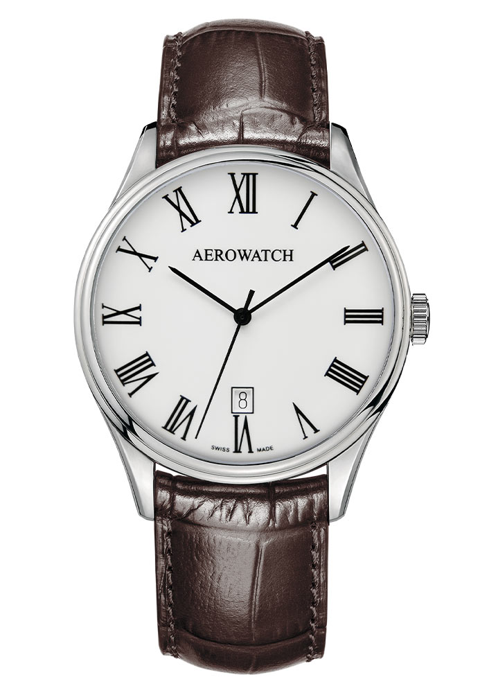 Minimalistický ciferník hodinek Aerowatch vyzařuje eleganci a čistotu. Zobrazení data v šest hodin přidává funkcionalitu, která vám umožní sledovat aktuální den v měsíci. Přehledné římské indexy usnadňují přesné odečítání času a zároveň zdůrazňují klasický design hodinek. Celé to kryje safírové sklíčko odolné proti poškrábání, zajišťující dlouhodobou čirost ciferníku. Uvnitř pevného pouzdra je instalován švýcarský mechanismus, který zajišťuje mimořádnou přesnost při zobrazování aktuálního času.