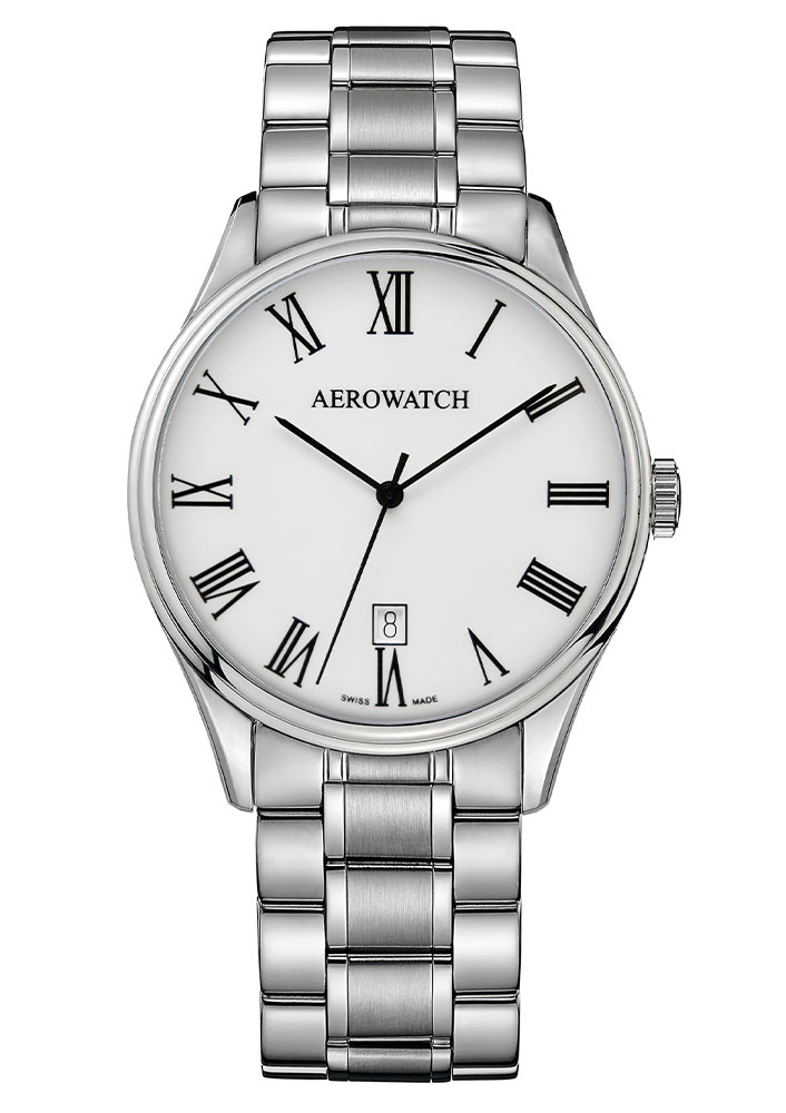 Minimalistický ciferník hodinek Aerowatch vyzařuje eleganci a čistotu. Zobrazení data v šest hodin přidává funkcionalitu, která vám umožní sledovat aktuální den v měsíci. Přehledné římské indexy usnadňují přesné odečítání času a zároveň zdůrazňují klasický design hodinek. Celé to kryje safírové sklíčko odolné proti poškrábání, zajišťující dlouhodobou čirost ciferníku. Uvnitř pevného pouzdra je instalován švýcarský mechanismus, který zajišťuje mimořádnou přesnost při zobrazování aktuálního času.
