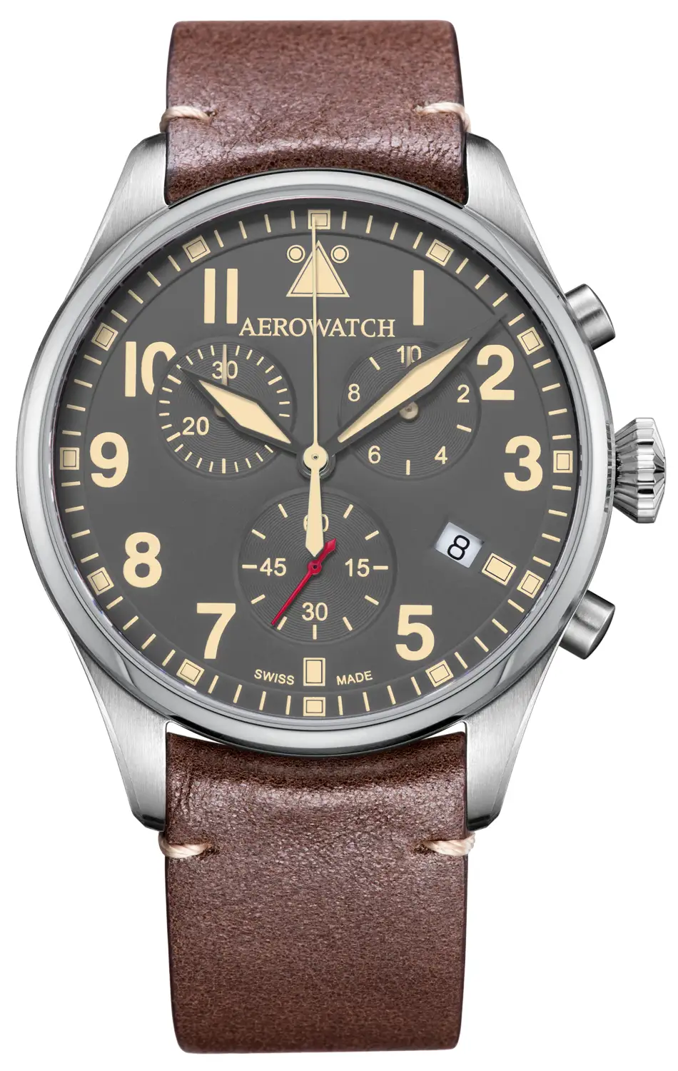Aerowatch Les Grandes Classiques Chrono Pilot A 79990 AA09 jsou pánské hodinky v pilotním stylu, které kombinují klasický design s praktickými funkcemi chronografu. Dominantou je ciferník s pilotním uspořádáním – velkými béžovými arabskými číslicemi kontrastujícími s matným šedým pozadím. Tento design je inspirován pilotními hodinkami z poloviny 20. století, avšak realizován moderní švýcarskou přesností.