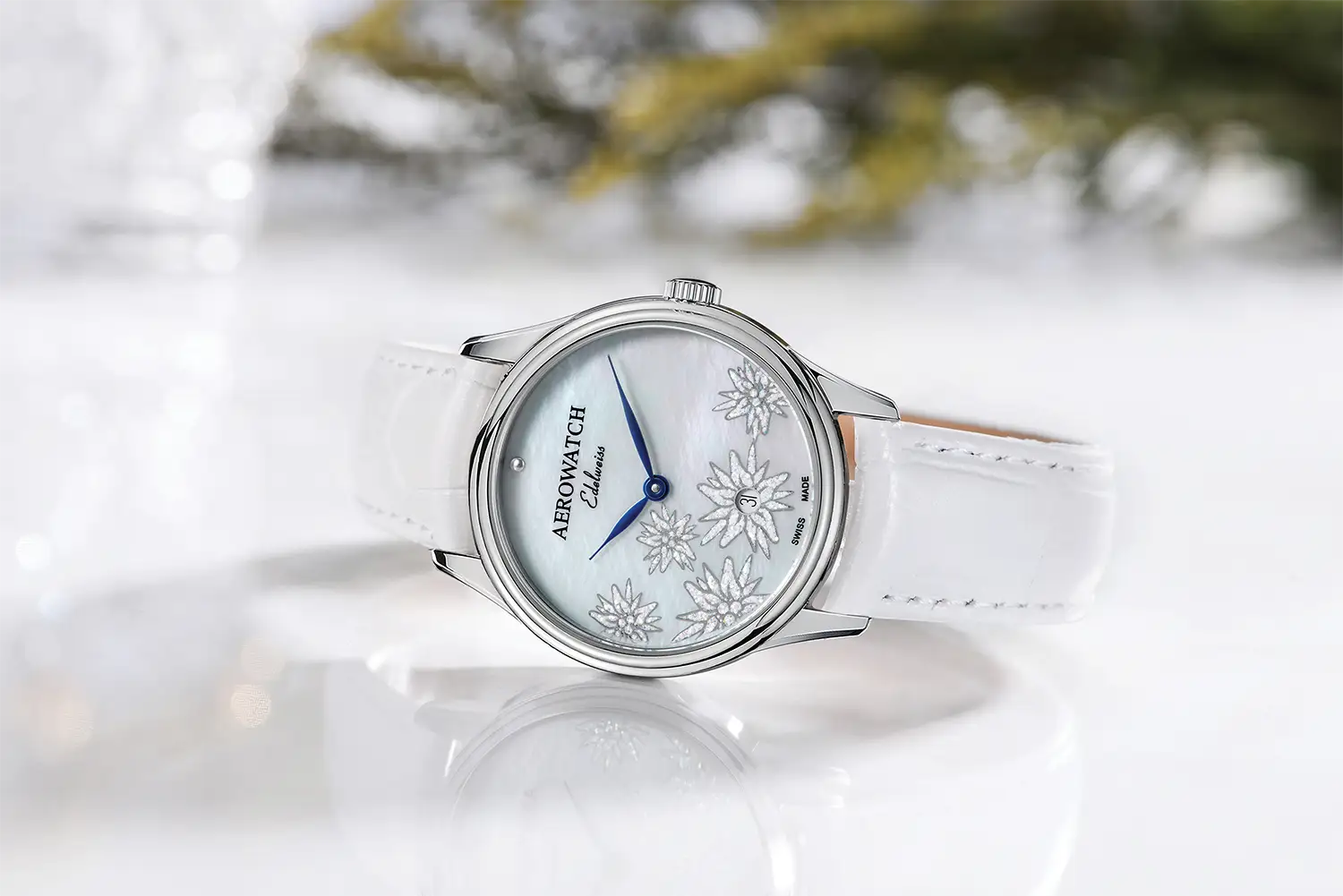 Dámské hodinky Aerowatch Les Grandes Classiques Edelweiss Lady A 49101 AA03 představují jemnou podobu klasiky v ocelovém pouzdře a s bílým koženým řemínkem. Model vyniká svou jemností, ale zároveň přehledným číselníkem a detaily, které potvrzují jeho švýcarský původ.