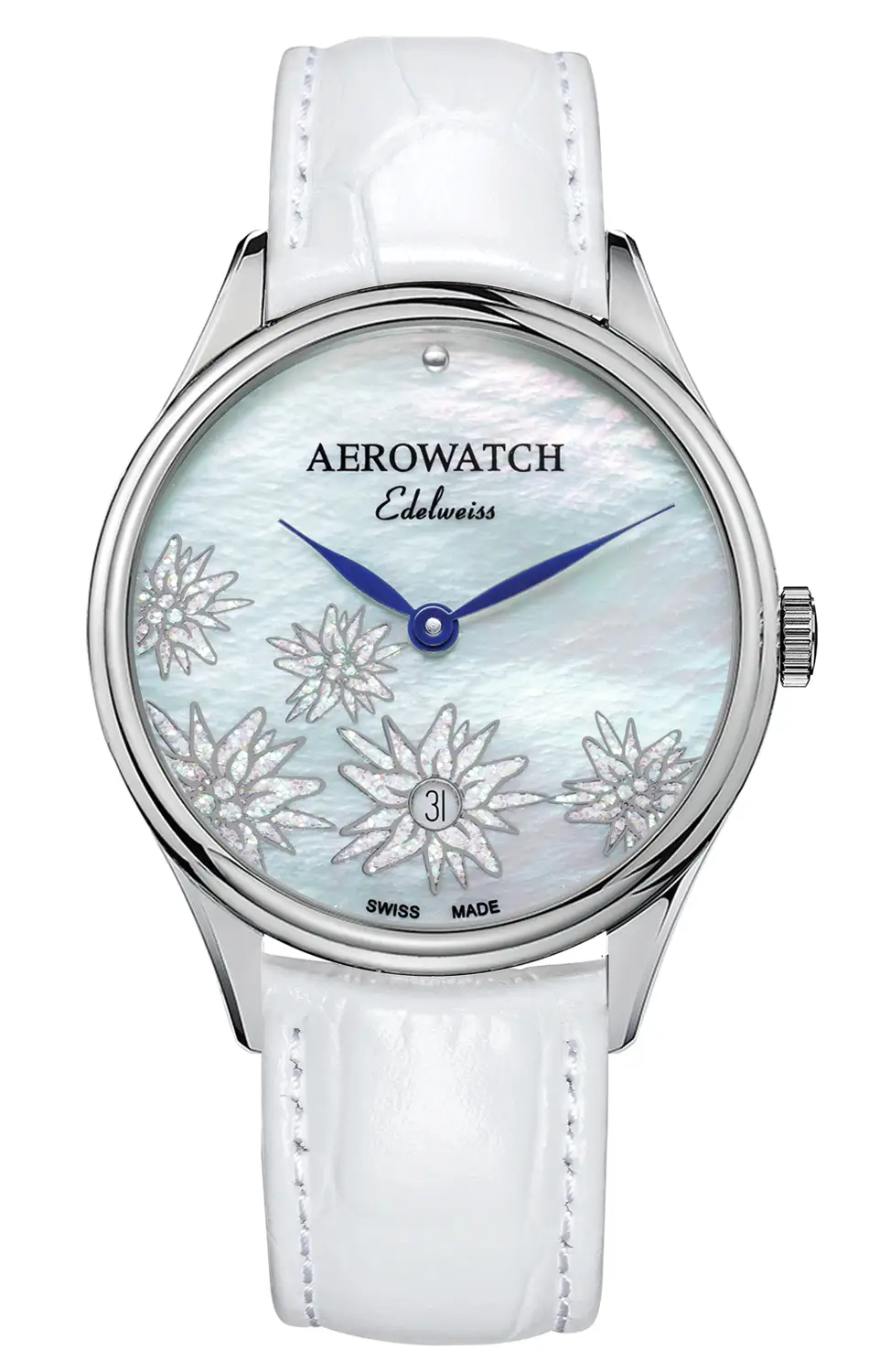Pouzdro o průměru 31 mm je vyrobeno z leštěné nerezové oceli, jejíž vyvážený lesk ladí se světlým řemínkem. Perleťový číselník je zdoben motivem alpské protěže – jemným, ale výrazným díky hře světla a textury. Tenké modré ručky jsou dobře viditelné na světlém podkladu. Na pozici šesté hodiny se nachází datumovka, která nenarušuje přehlednost ani symetrii rozvržení. Řemínek je vyroben z bílé přírodní kůže s elegantním krokodýlím vzorem. Ukončen je ocelovou sponou a poskytuje pohodlí při každodenním nošení, a zároveň ladí jak s kancelářským, tak společenským outfitem. Číselník shora chrání safírové sklíčko odolné proti poškrábání, které zajišťuje vynikající průhlednost i trvanlivost.