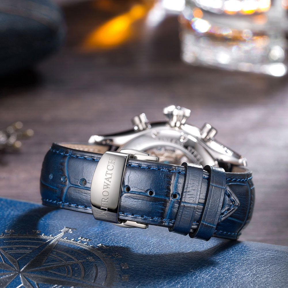 Hodinky Aerowatch Moonphase Limited Edition na koženém řemínku jsou vybaveny vylepšeným automatickým strojkem ETA Valjoux 7750 s 25 drahokamy, mistrovsky propracovanými hodináři Aerowatch. Mechanismus je zdoben klasickým vzorem "côtes de Genève" a charakteristickými modrými šrouby a jeho rezerva chodu dosahuje 42 hodin, což zajišťuje spolehlivost a přesnost provozu. Jeho srdcem je legendární mechanismus VALJOUX 7750 TOP GRADE, uznávaný odborníky jako jeden z nejlepších mechanických chronografů, ceněný pro svůj jedinečný design a bezkonkurenční přesnost.