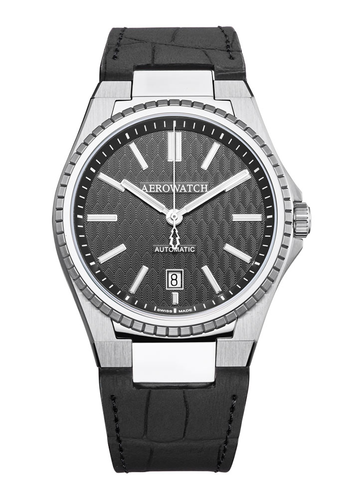 Pánské Aerowatch Milan A 60998 AA03 je kulaté ocelové pouzdro o průměru 41 mm, stříbrné barvy. Na přední straně pouzdra je prstenec s ozubeným zakončením. Kožený a gumový řemínek s motýlkovou sponou je černé barvy a je integrován do pouzdra. Safírové sklíčko, extrémně tvrdé a těžko poškrábatelné, chrání krásný šedý ciferník. Ciferník se vzorem jedlové větve má velké lineární indexy a velmi dobře čitelné obdélníkové ručičky. Indexy, hodinová a minutová ručka jsou vyplněny luminiscenčním materiálem, který umožňuje odečítání času za zhoršených světelných podmínek. Zvláštní pozornost si zaslouží sekundová ručička zdobená jedlí. V 6 hodin je datumové okno, které ukazuje aktuální den v měsíci. Celý ciferník hodinek Aerowatch Milan je pozvánkou k duševní procházce nádhernou rozlehlostí pohoří Jura.