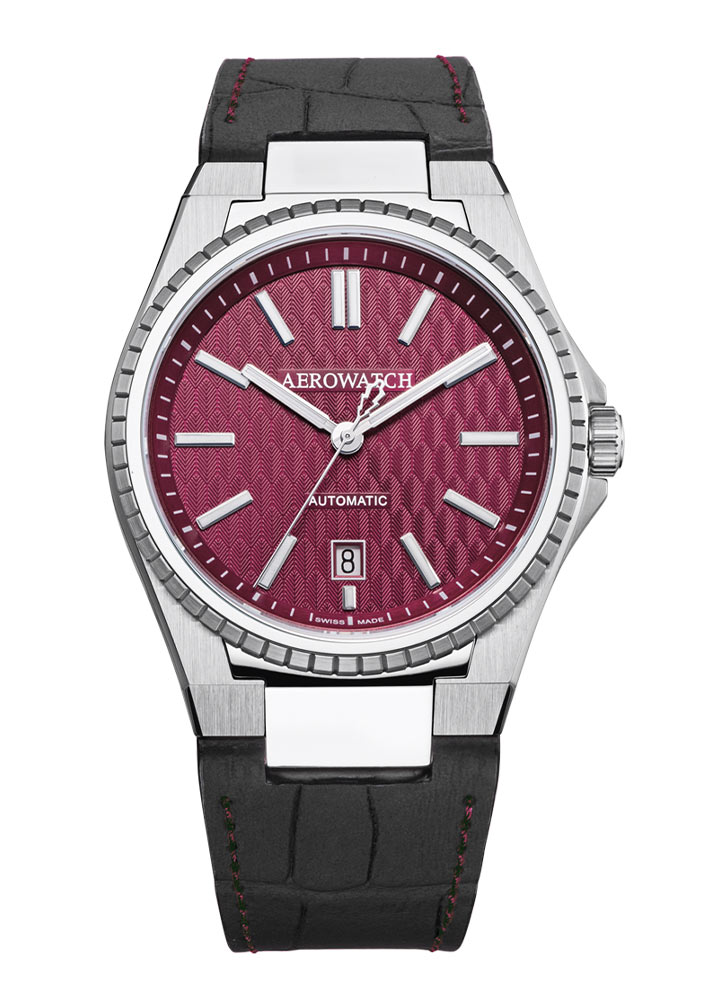 Pánské Aerowatch Milan A-60998-AA06 je kulaté ocelové pouzdro o průměru 41 mm, stříbrné barvy. Na přední straně pouzdra je prstenec s ozubeným zakončením. Kožený řemínek s motýlkovou sponou je černý a je integrován do pouzdra. Kvalitní safírové sklíčko, extrémně tvrdé a těžko poškrábatelné, chrání krásný červený ciferník. Ciferník se vzorem jedlové větve má velké indexy a velmi dobře čitelné obdélníkové ručky. Indexy, hodinová a minutová ručka jsou vyplněny luminiscenčním materiálem Super-LumiNova®, který umožňuje odečítat čas za špatných světelných podmínek. Pozoruhodná je především vteřinovka, kterou zdobí detail po vzoru jedle. V 6 hodin je datumové okno, které ukazuje aktuální den v měsíci. Celý ciferník hodinek Aerowatch Milan je pozvánkou k duševní procházce nádhernou rozlehlostí pohoří Jura.