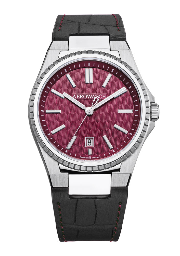 Krásný červený ciferník chrání kvalitní safírové sklíčko, které se jen těžko poškrábe. Disk se vzorem jedlové větve má velké indexy a velmi dobře čitelné obdélníkové ručičky. Indexy, hodinová a minutová ručka jsou vyplněny luminiscenční hmotou Super-LumiNova®. Umožní vám odečítat čas za zhoršených světelných podmínek. Pozoruhodná je především vteřinovka, kterou zdobí detail po vzoru jedle. V 6 hodin je datumové okno, které ukazuje aktuální den v měsíci. Celý ciferník quartzových hodinek Aerowatch Milan je pozvánkou k duševní procházce nádhernou rozlehlostí pohoří Jura. Pod číselníkem je instalován přesný švýcarský quartz strojek s funkcí End Of Life. EOL vás bude informovat o nutnosti výměny baterie – sekundová ručička naskočí indexy každých pár sekund.