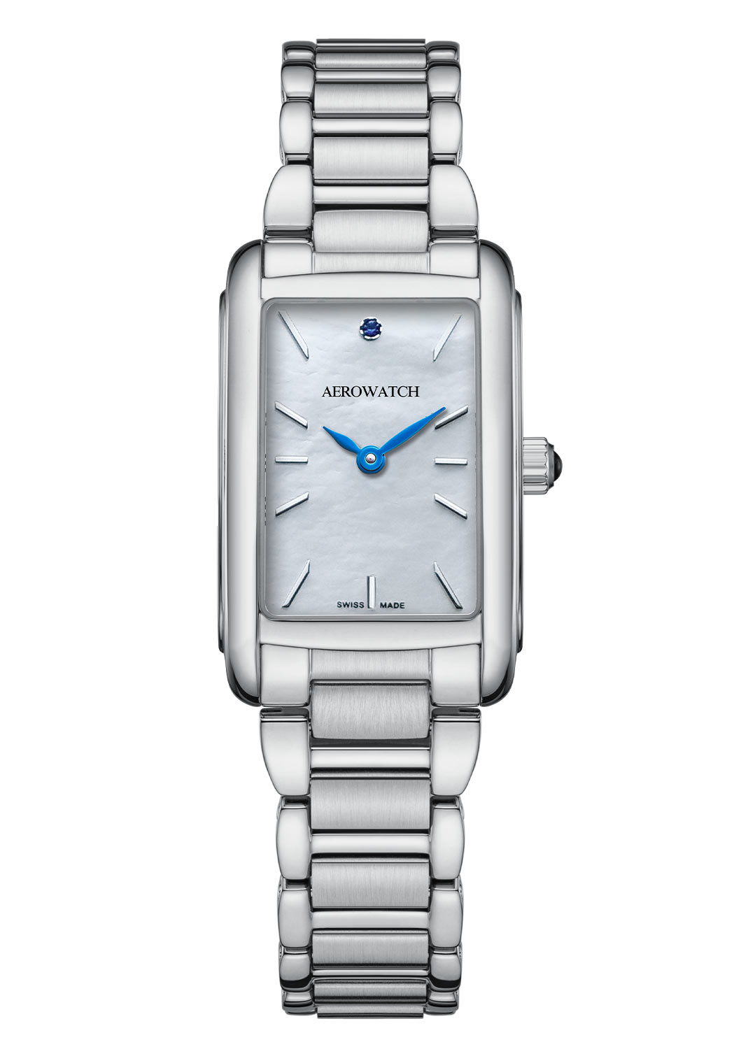 Švýcarské dámské hodinky Aerowatch Mini Intuition Lady A 30104 AA02 M jsou kvintesence elegance uzavřená v obdélníkovém pouzdře z nerezové oceli, která zdůrazňuje jejich klasický, ale zároveň moderní styl. Ciferník hodinek zdobený jemnou perletí vyzařuje auru sofistikovanosti a jemné minimalistické indexy mu dodávají výjimečnou lehkost. Ve 12 hodin ozdobný drahokam dodává jemnou jiskru a vytříbený charakter. Mimořádně poutavé modré ruce s celkem krásně kontrastují. To vše vytváří dokonale vyváženou a harmonickou kompozici, která přitahuje pozornost.