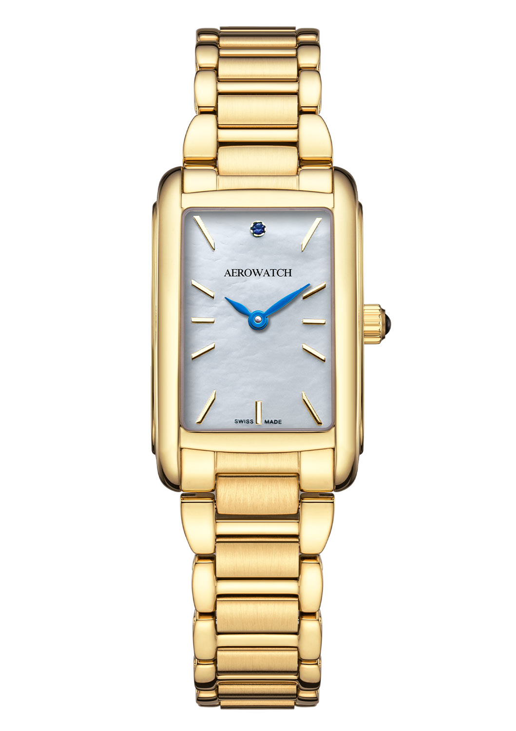 Pozlacené dámské náramkové hodinky Aerowatch jsou dostupné ve velikosti 33 mm x 21 mm. Pouzdro a ocelový pásek jsou pokryty zlatým PVD povlakem, který zkrášluje design a dodává tomuto modelu charakter. Přední stranu pouzdra kryje safírové sklíčko, které se těžko poškrábe. Pozlacené hodinky podepsané značkou Aerowatch jsou švýcarským dílem hodinářského umění, což zdůrazňují decentní nápisy „Swiss Made“ ve spodní části ciferníku. Celek se vyznačuje elegancí a minimalismem, ideální pro formální příležitosti i každodenní styling pro člověka, který ocení klasickou krásu s moderním akcentem.