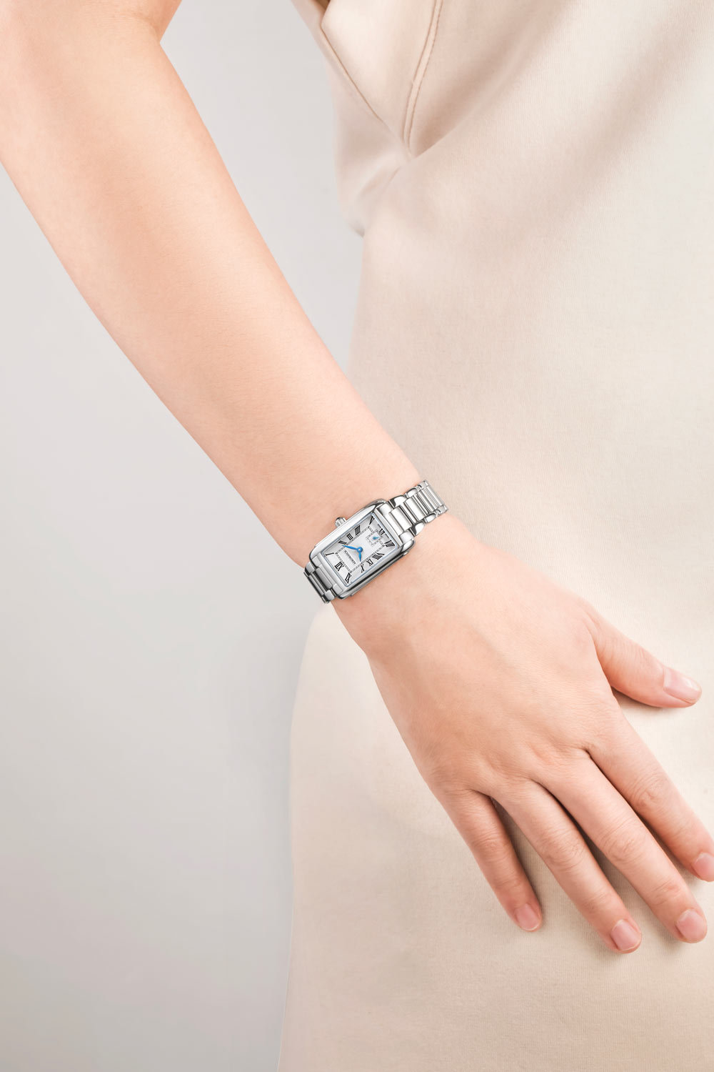 Švýcarské dámské hodinky Aerowatch Mini Intuition Lady A 31104 AA01 M jsou kvintesencí elegance uzavřenou v obdélníkovém pouzdře z nerezové oceli, které zdůrazňuje jejich klasický, ale zároveň moderní styl. Stříbrný ciferník hodinek zprostředkovává auru sofistikovanosti a elegantní římské indexy jim dodávají jedinečnou třídu. Mimořádně poutavé modré ruce s celkem krásně kontrastují. Tento model je zavěšen na třířadém ocelovém náramku. To vše vytváří dokonale vyváženou a harmonickou kompozici, která přitahuje pozornost.