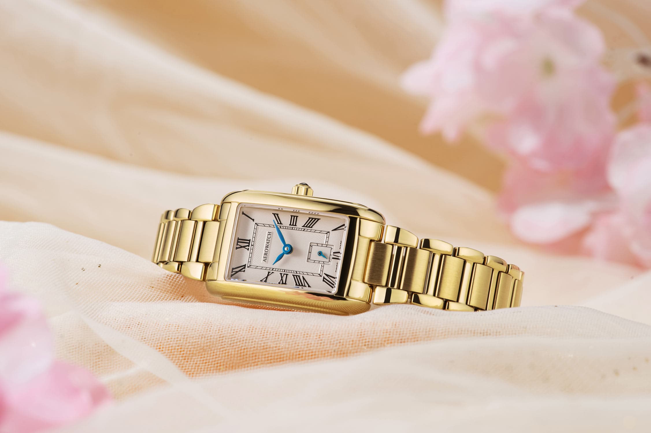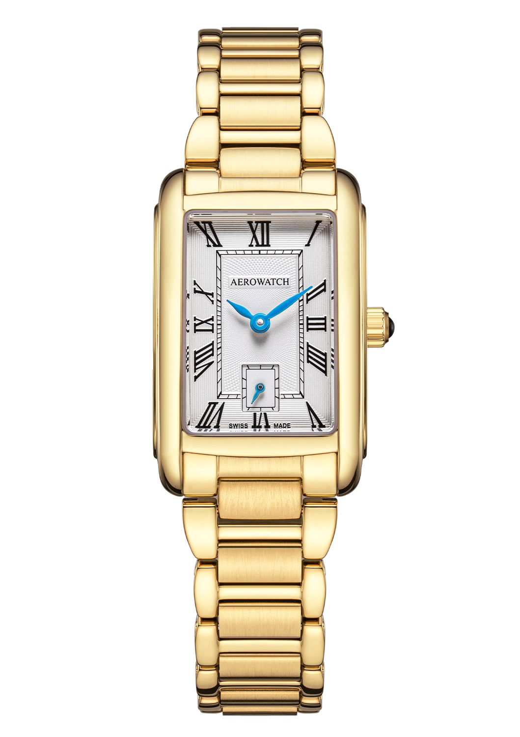 Elegantní dámské náramkové hodinky Aerowatch jsou dostupné ve velikosti 33 mm x 21 mm. Pouzdro je pokryto PVD povlakem, který dodává designu silný charakter. Přední stranu pouzdra kryje safírové sklíčko, které se těžko poškrábe. Pozlacené hodinky podepsané značkou Aerowatch jsou švýcarským dílem hodinářského umění, což zdůrazňují decentní nápisy „Swiss Made“ ve spodní části ciferníku. Celek se vyznačuje elegancí a minimalismem, ideální pro formální příležitosti i každodenní styling pro člověka, který ocení klasickou krásu s moderním akcentem.