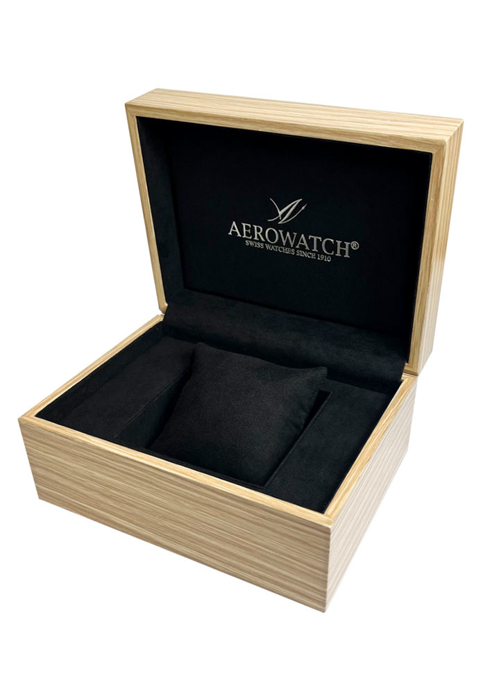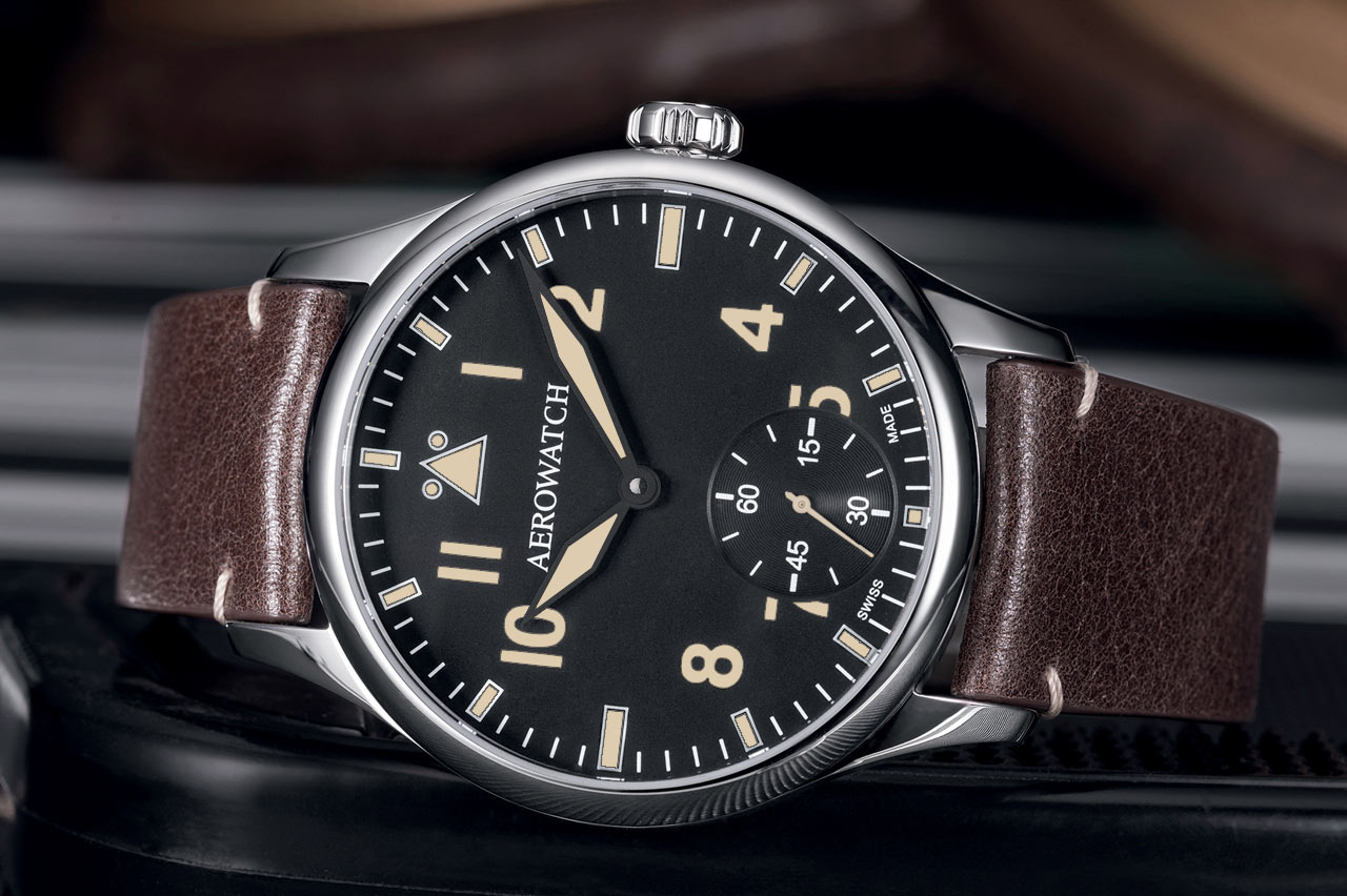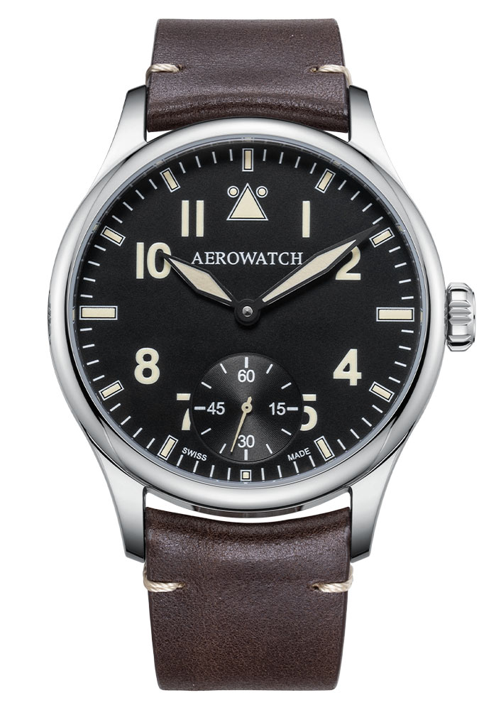 Jedinečným prvkem těchto hodinek je leštěný vypouklý ciferník se samostatným vteřinovým ciferníkem, který přináší jemnost a sofistikovanost. Černý ciferník v leteckém stylu umístěný ve 43-milimetrovém pouzdře dokonale ladí s hnědým řemínkem z na dotek příjemné přírodní kůže. Použití těch nejkvalitnějších materiálů, jako je nerezová ocel a safírové sklo, zaručuje odolnost a spolehlivost Aerowatch. Uvnitř pouzdra se nachází unikátní ruční natahovací mechanismus AERO DB9 SWISS s rezervou chodu až 46 hodin. Činnost tohoto komplexního systému lze obdivovat díky průhlednému krytu na zadní straně krytu.