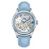 Na pozadí mechanismu krásně vynikají štíhlé modré ručky. Jejich sytá barva kontrastuje se světlými tóny a dekoracemi strojku a zvýrazňuje architektonickou stavbu celku. Tento model nepotřebuje žádné komplikace – jeho síla spočívá v detailech.